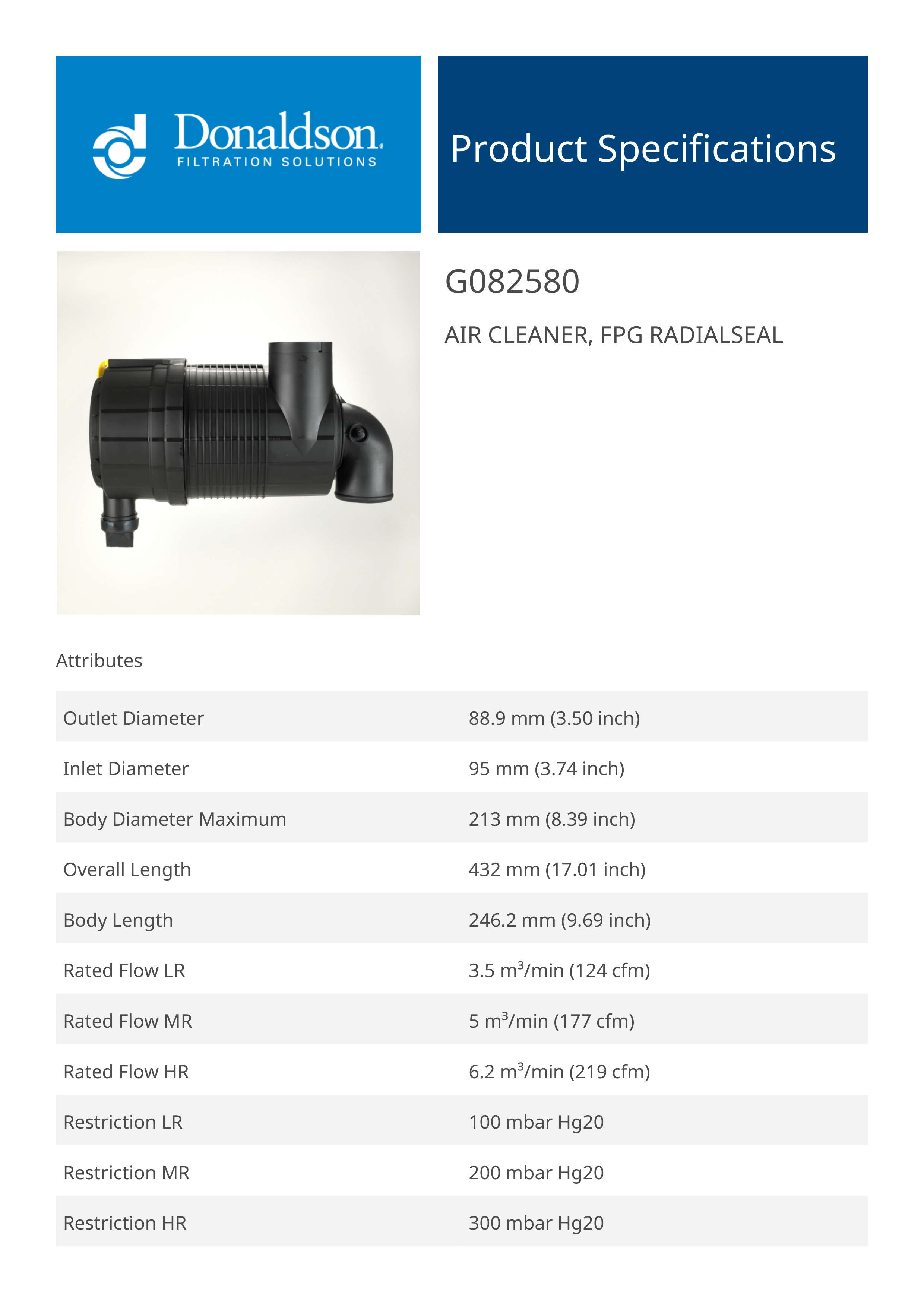 Genuine Donaldson G082580 Air Cleaner, Fpg Radialseal is designed to provide reliable performance in air cleaner, fpg radialseal applications. Built with high-quality materials, it ensures consistent functionality and durability.