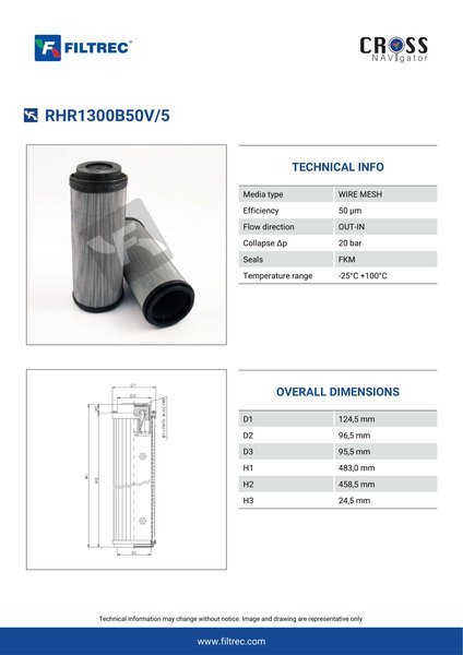 Genuine Filtrec RHR1300B50V/5. This Filtrec element is designed to meet or exceed the quality and performance of brand OEM’s ensuring superior filtration performance and long-lasting durability.
