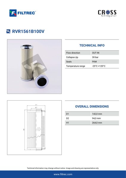 Genuine Filtrec RVR1561B100V. This Filtrec element is designed to meet or exceed the quality and performance of brand OEM’s ensuring superior filtration performance and long-lasting durability.Engineered with their high performance media and a durable design, the RVR1561B100V provides reliable and consistent performance over its lifespan, even in harsh operating environments. When you order from FilterFinder, you can trust that you are getting a reliable and high-quality replacement filter that will keep your system running smoothly.