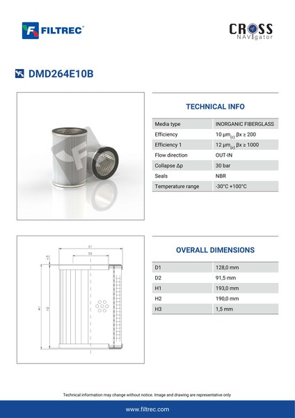The efficiency of the element is shown using the Micron (µ) and Beta (β) ratings. The micron rating indicates the size of the particle being filtered and the beta rating the efficiency, calculated as 1/β.