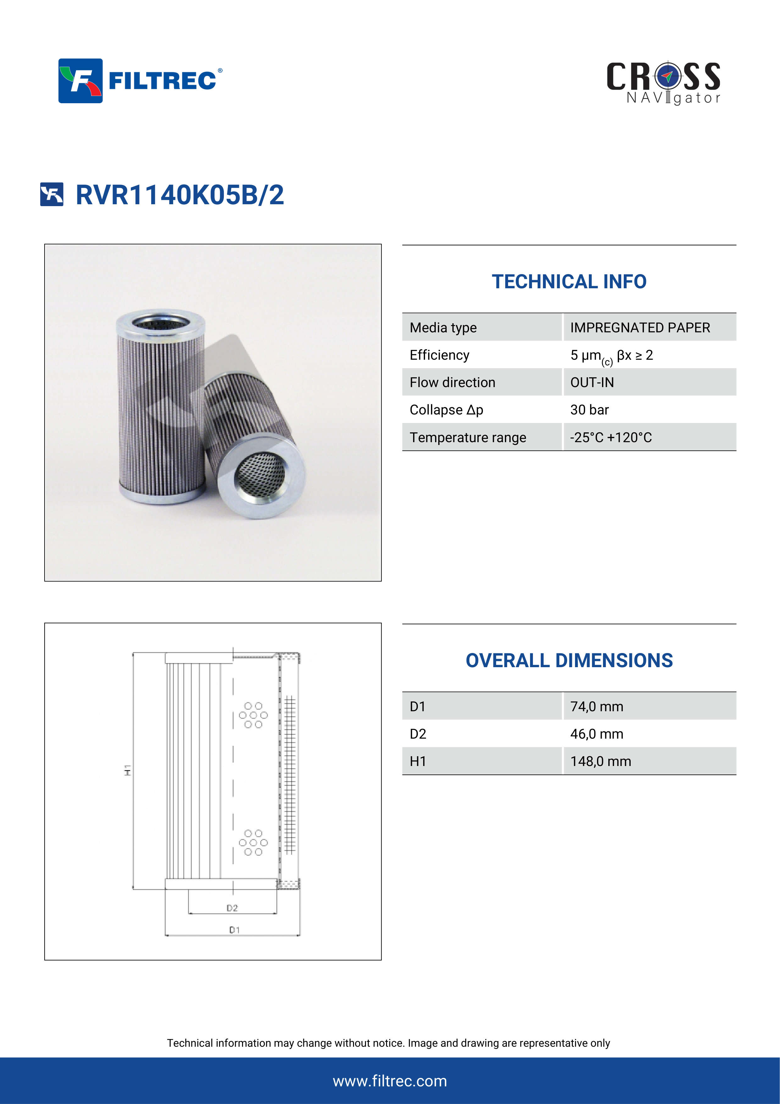 Genuine Filtrec RVR1140K05B/2. This Filtrec element is designed to meet or exceed the quality and performance of brand OEM’s ensuring superior filtration performance and long-lasting durability.Engineered with their high performance media and a durable design, the RVR1140K05B/2 provides reliable and consistent performance over its lifespan, even in harsh operating environments. When you order from FilterFinder, you can trust that you are getting a reliable and high-quality replacement filter that will keep your system running smoothly.