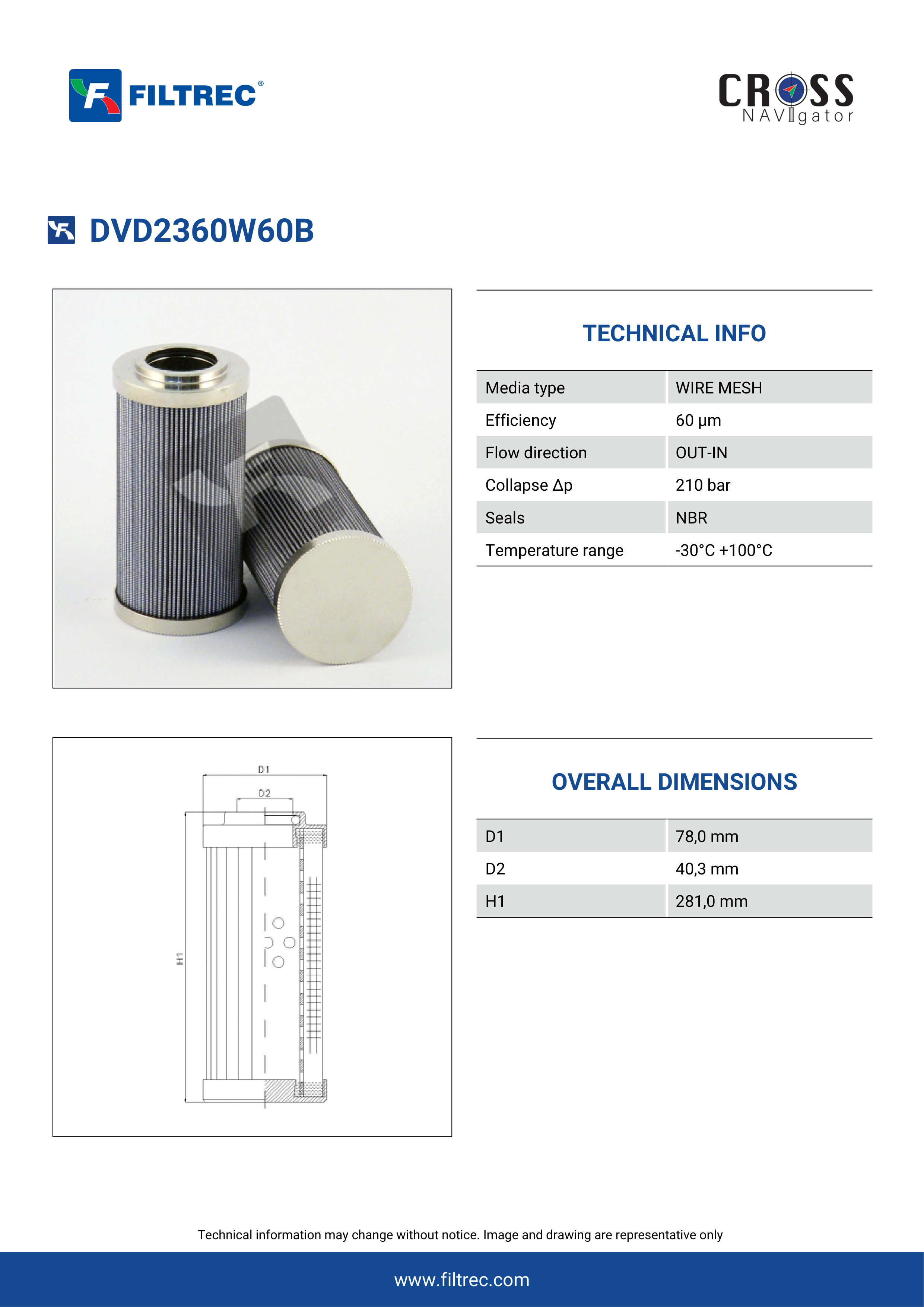 Genuine Filtrec DVD2360W60B. This Filtrec element is designed to meet or exceed the quality and performance of brand OEM’s ensuring superior filtration performance and long-lasting durability.