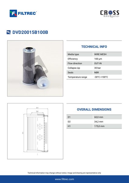 Genuine Filtrec DVD20015B100B. This Filtrec element is designed to meet or exceed the quality and performance of brand OEM’s ensuring superior filtration performance and long-lasting durability.