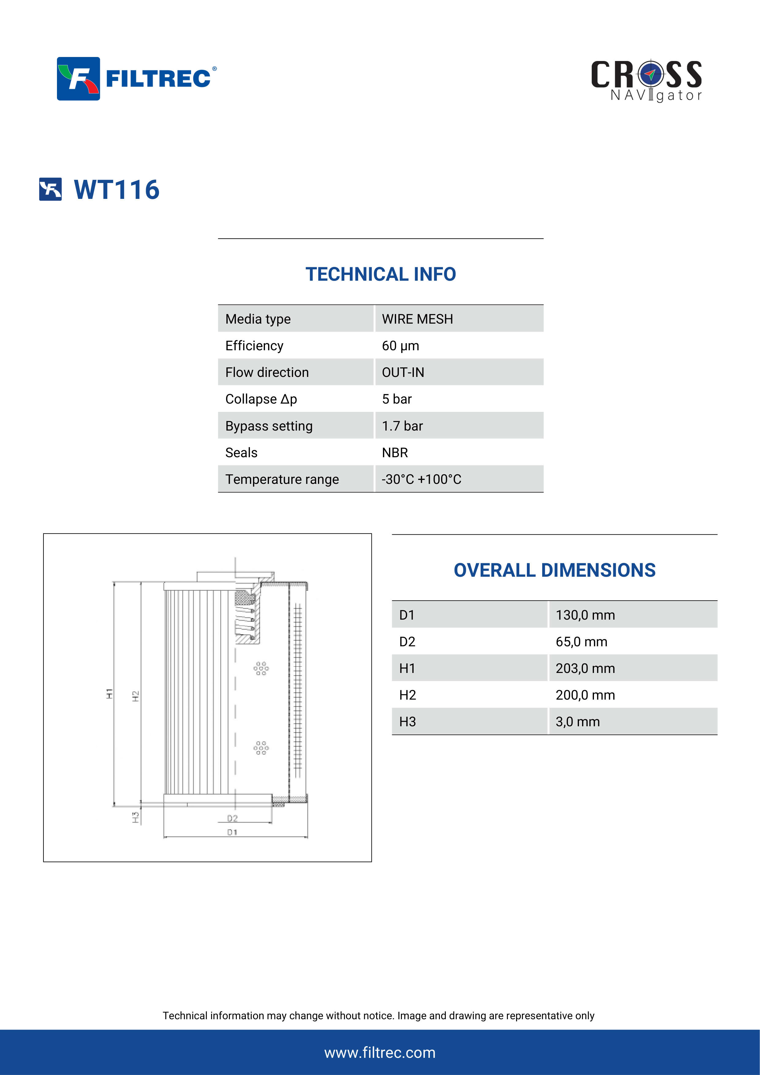 Genuine Filtrec WT116. This Filtrec element is designed to meet or exceed the quality and performance of brand OEM’s ensuring superior filtration performance and long-lasting durability.