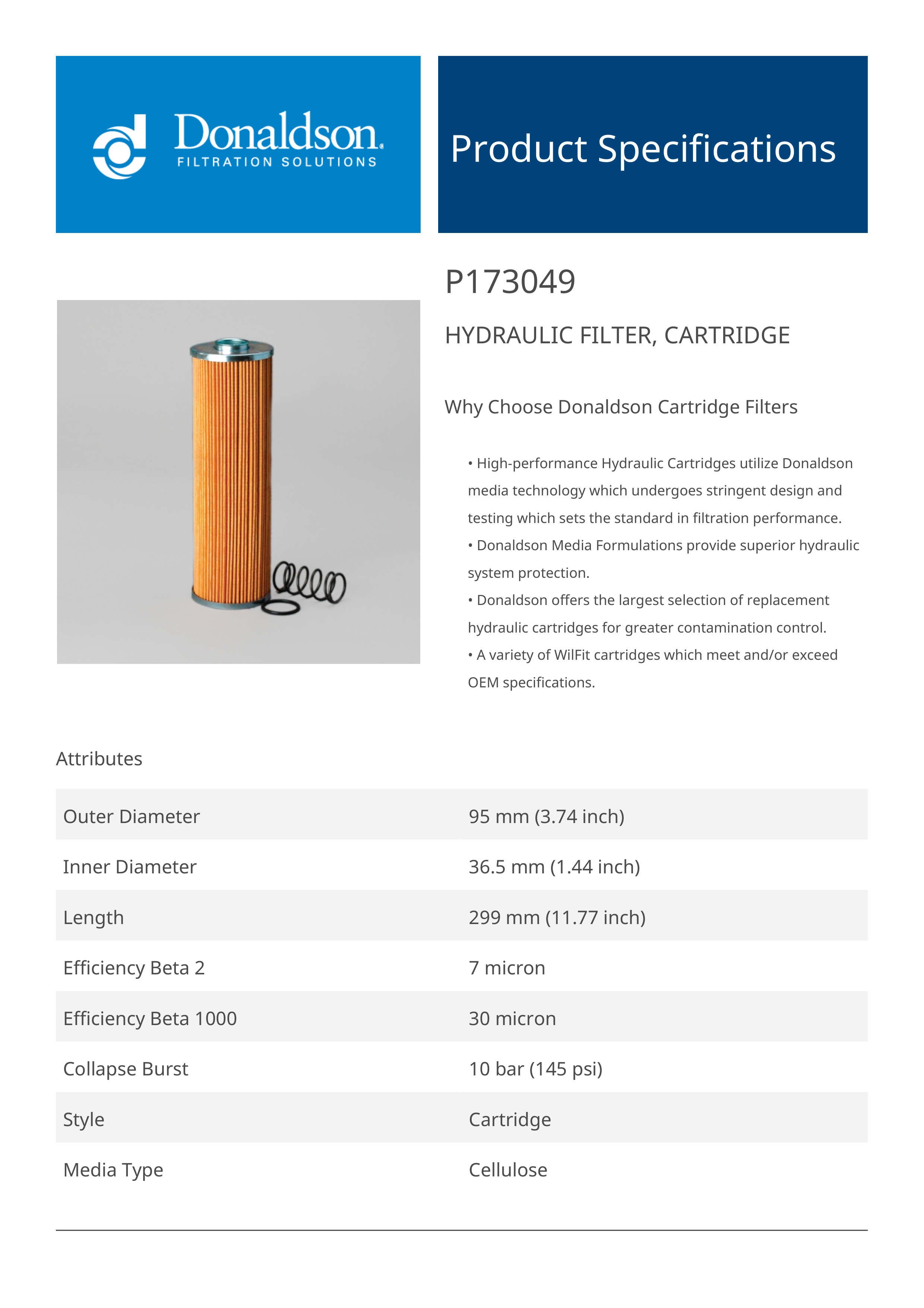 Genuine Donaldson P173049 Hydraulic Filter, Cartridge is designed to provide superior protection for your hydraulic system, effectively capturing contaminants to ensure clean fluid circulation. With high-quality filtration media, it extends equipment life, improves operational efficiency, and maintains fluid cleanliness even in the most demanding environments.