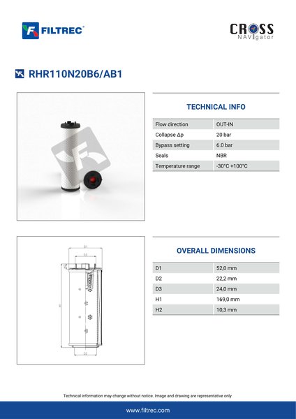 Filtrec RHR110N20B6/AB1 Replaces the Hydac 317177
