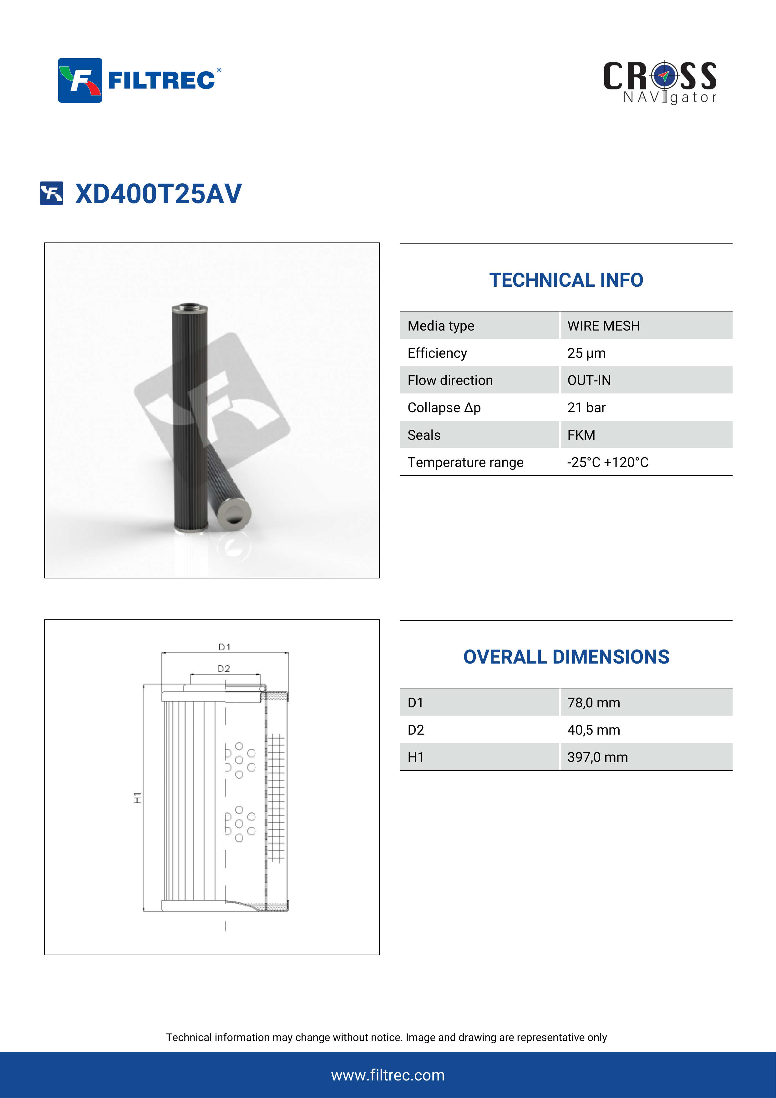 Genuine Filtrec XD400T25AV. This Filtrec element is designed to meet or exceed the quality and performance of brand OEM’s ensuring superior filtration performance and long-lasting durability.