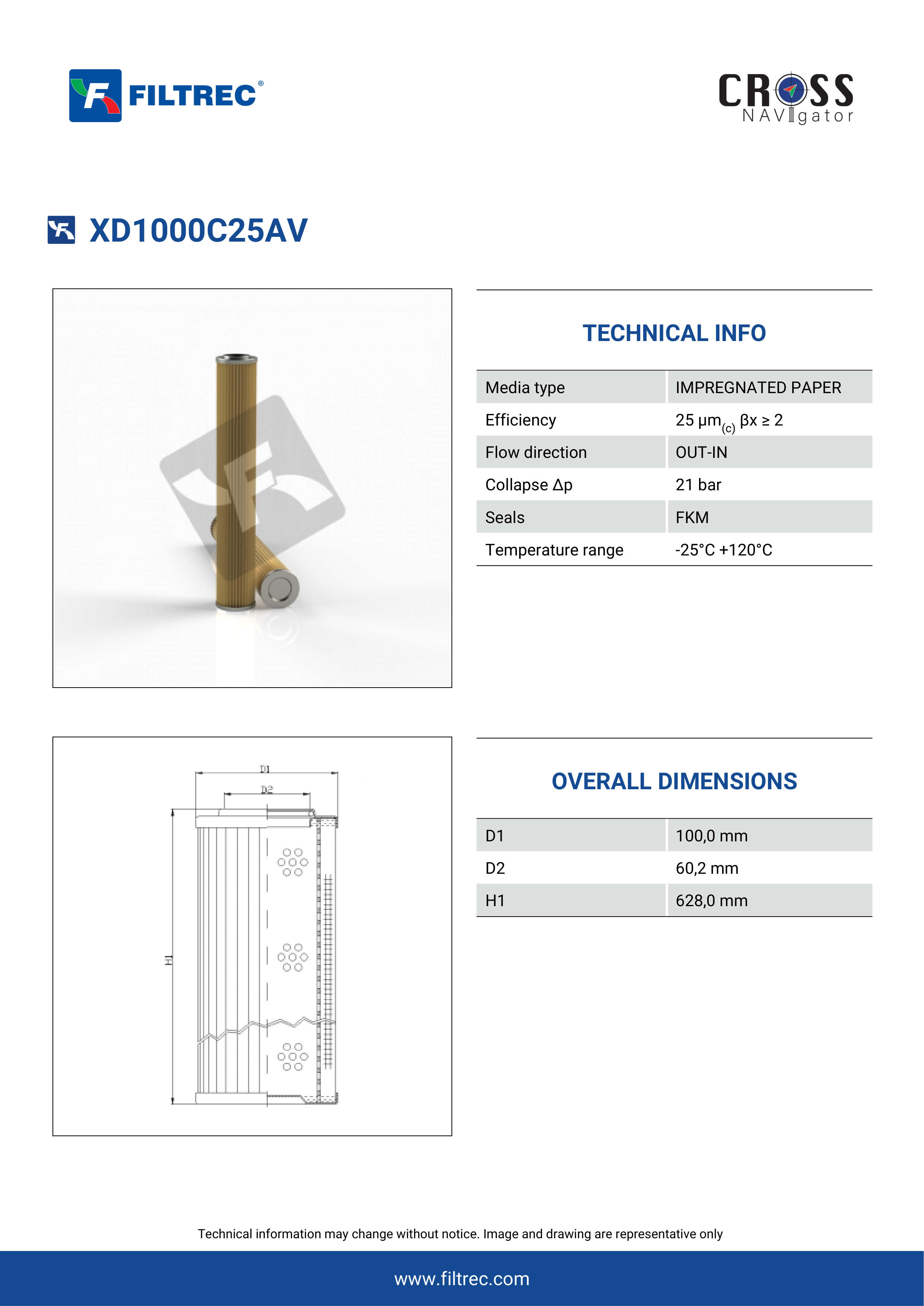 Genuine Filtrec XD1000C25AV. This Filtrec element is designed to meet or exceed the quality and performance of brand OEM’s ensuring superior filtration performance and long-lasting durability.