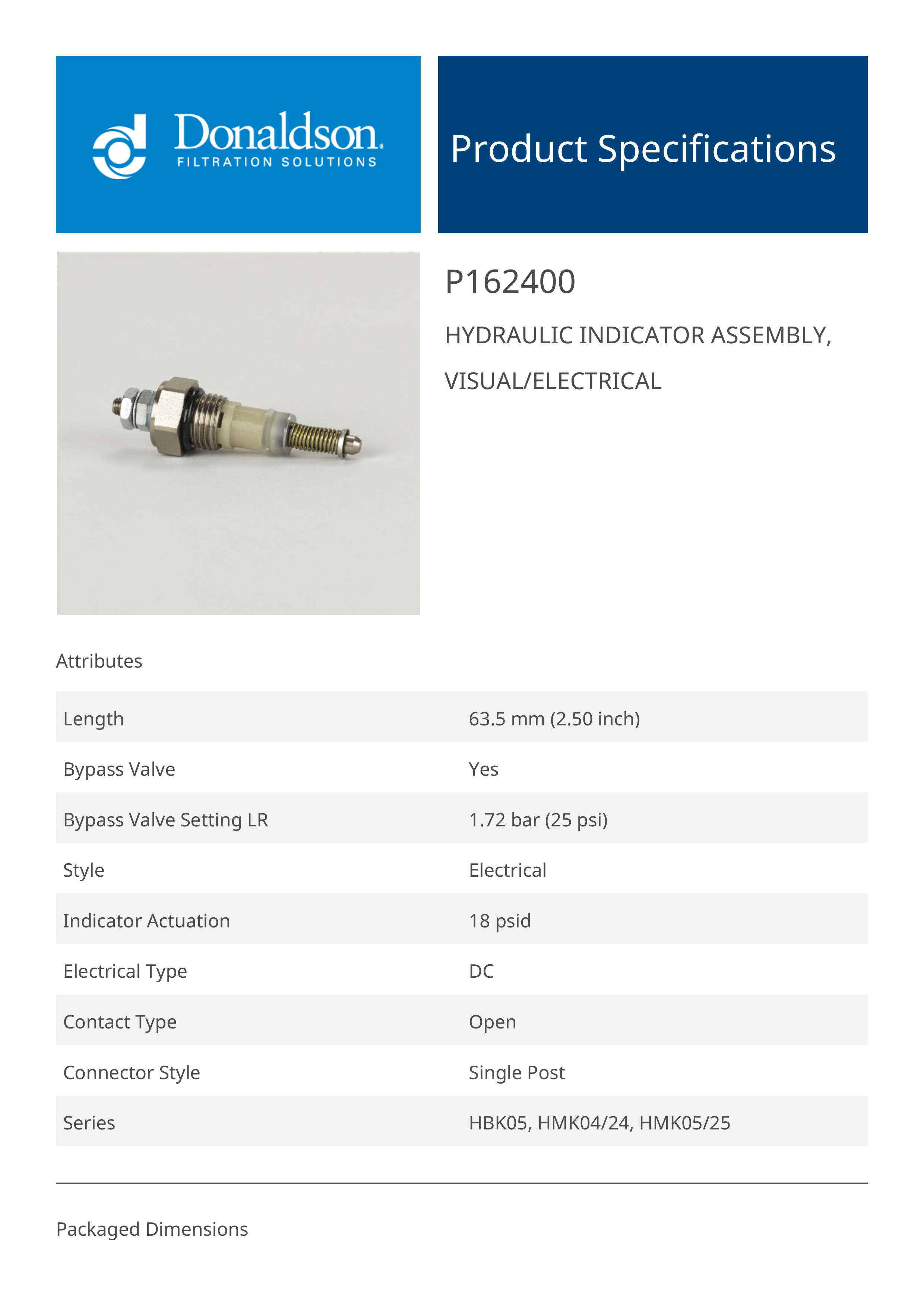 Genuine Donaldson P162400 Hydraulic Indicator Assembly, Visual/Electrical is designed to provide reliable performance in hydraulic indicator assembly, visual/electrical applications. Built with high-quality materials, it ensures consistent functionality and durability.