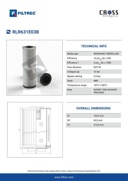 The efficiency of the element is shown using the Micron (µ) and Beta (β) ratings. The micron rating indicates the size of the particle being filtered and the beta rating the efficiency, calculated as 1/β.