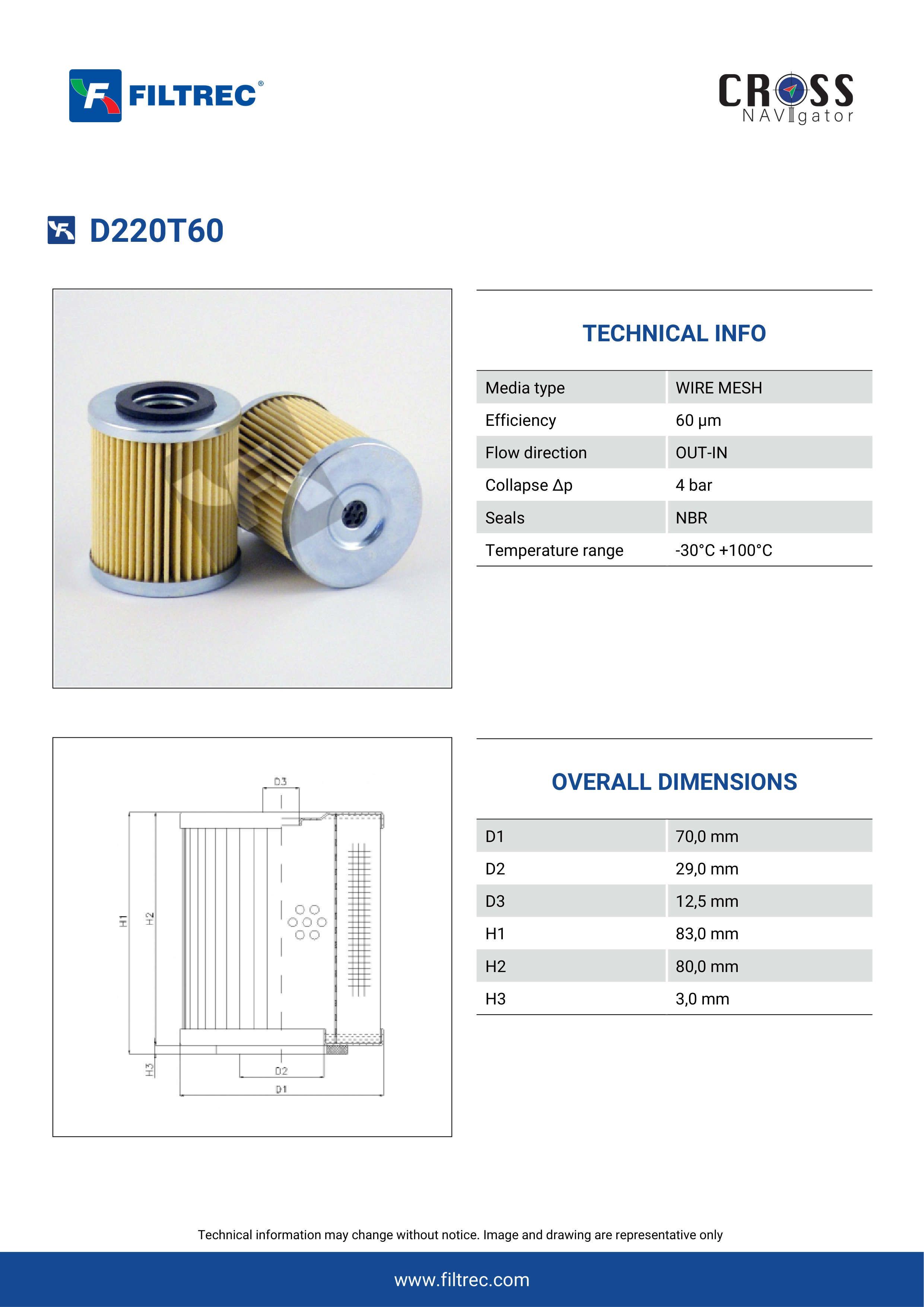 Genuine Filtrec D220T60. This Filtrec element is designed to meet or exceed the quality and performance of brand OEM’s ensuring superior filtration performance and long-lasting durability.