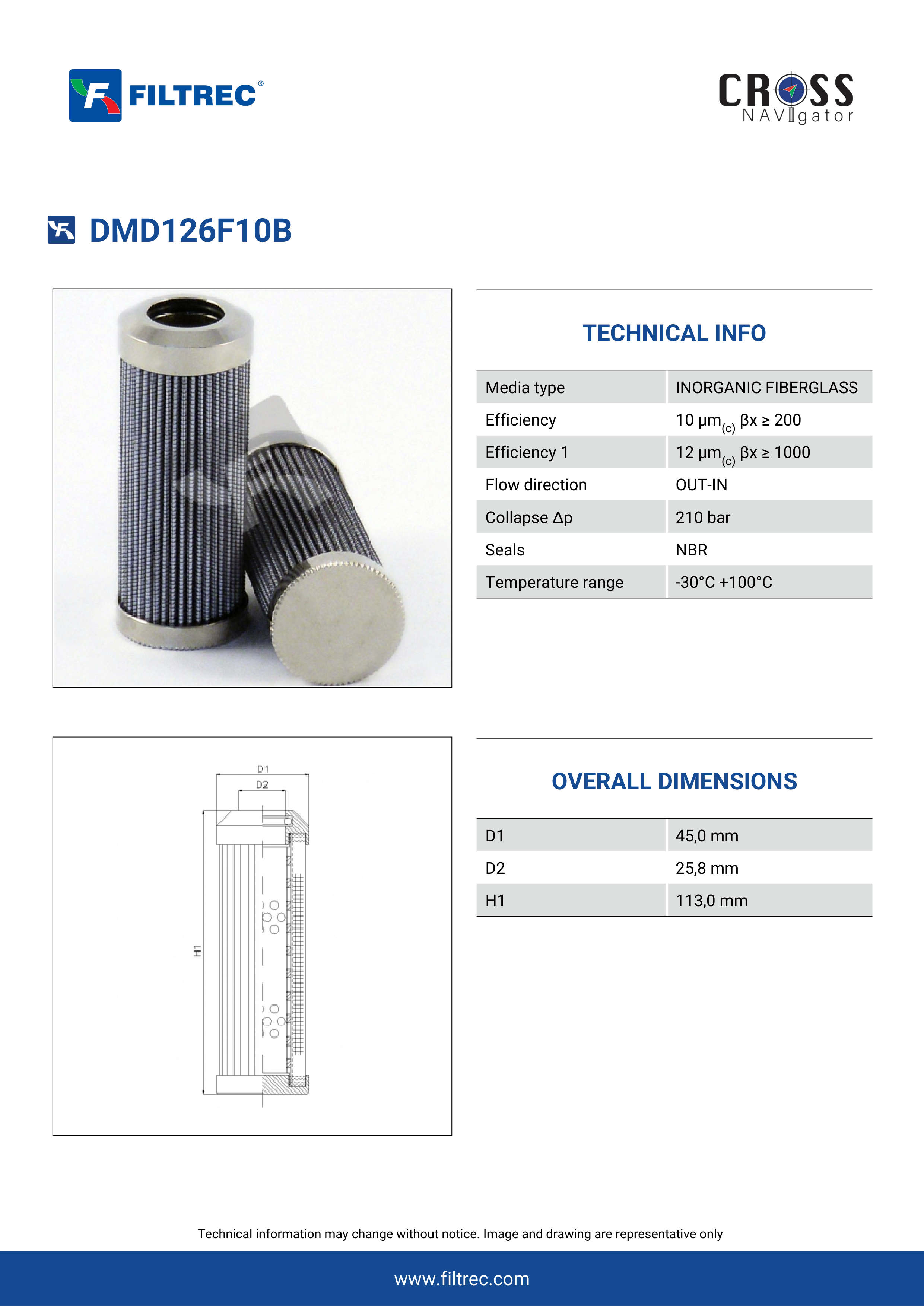 Genuine Filtrec DMD126F10B. This Filtrec element is designed to meet or exceed the quality and performance of brand OEM’s ensuring superior filtration performance and long-lasting durability.Engineered with their high performance media and a durable design, the DMD126F10B provides reliable and consistent performance over its lifespan, even in harsh operating environments. When you order from FilterFinder, you can trust that you are getting a reliable and high-quality replacement filter that will keep your system running smoothly.