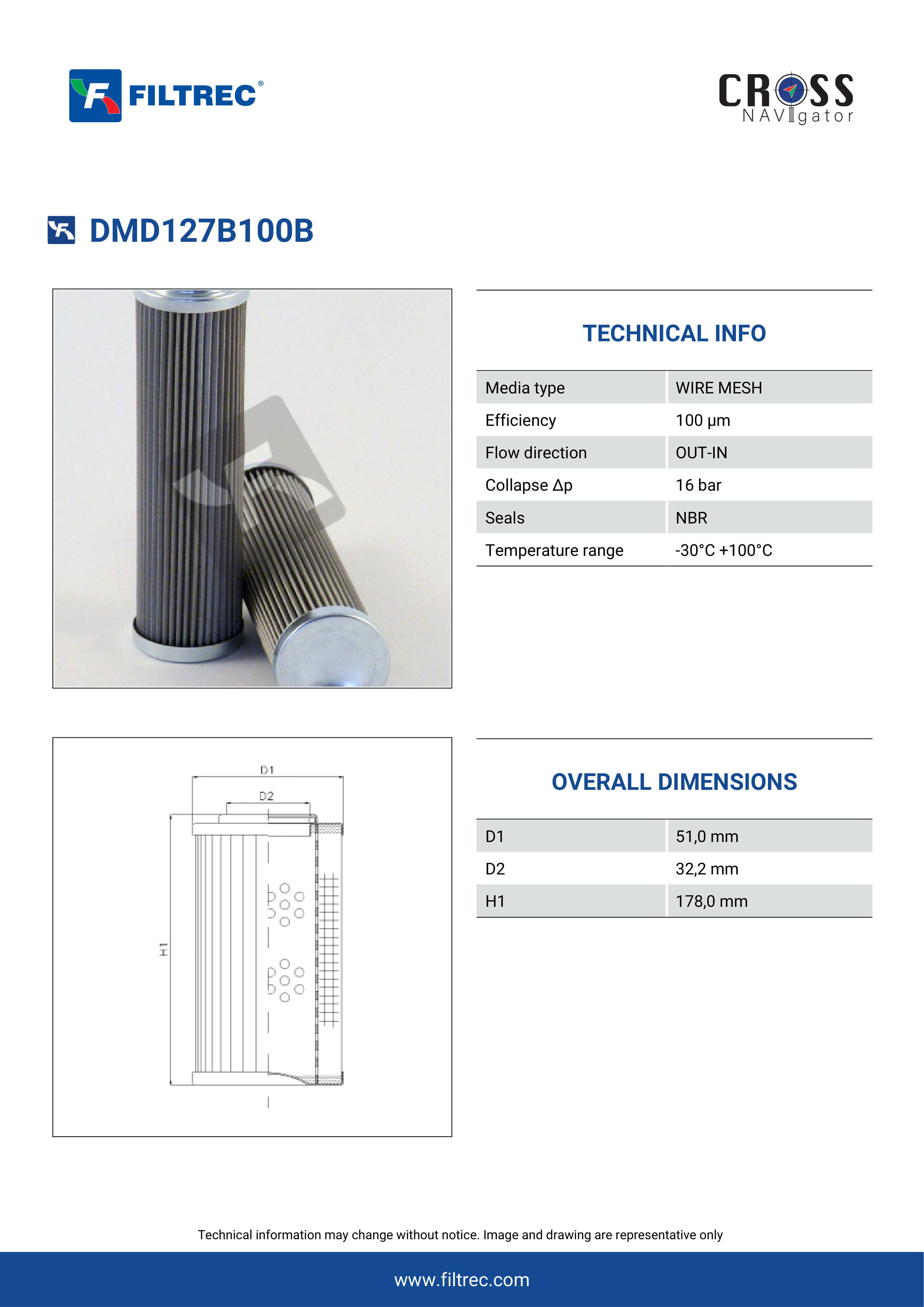 Genuine Filtrec DMD127B100B. This Filtrec element is designed to meet or exceed the quality and performance of brand OEM’s ensuring superior filtration performance and long-lasting durability.