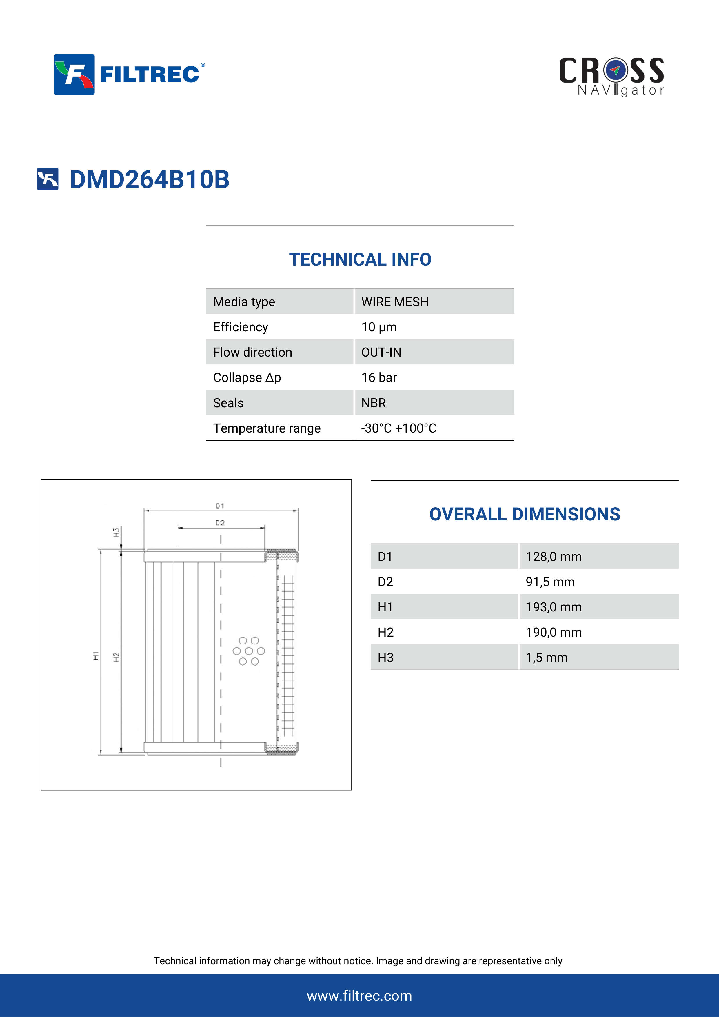Genuine Filtrec DMD264B10B. This Filtrec element is designed to meet or exceed the quality and performance of brand OEM’s ensuring superior filtration performance and long-lasting durability.