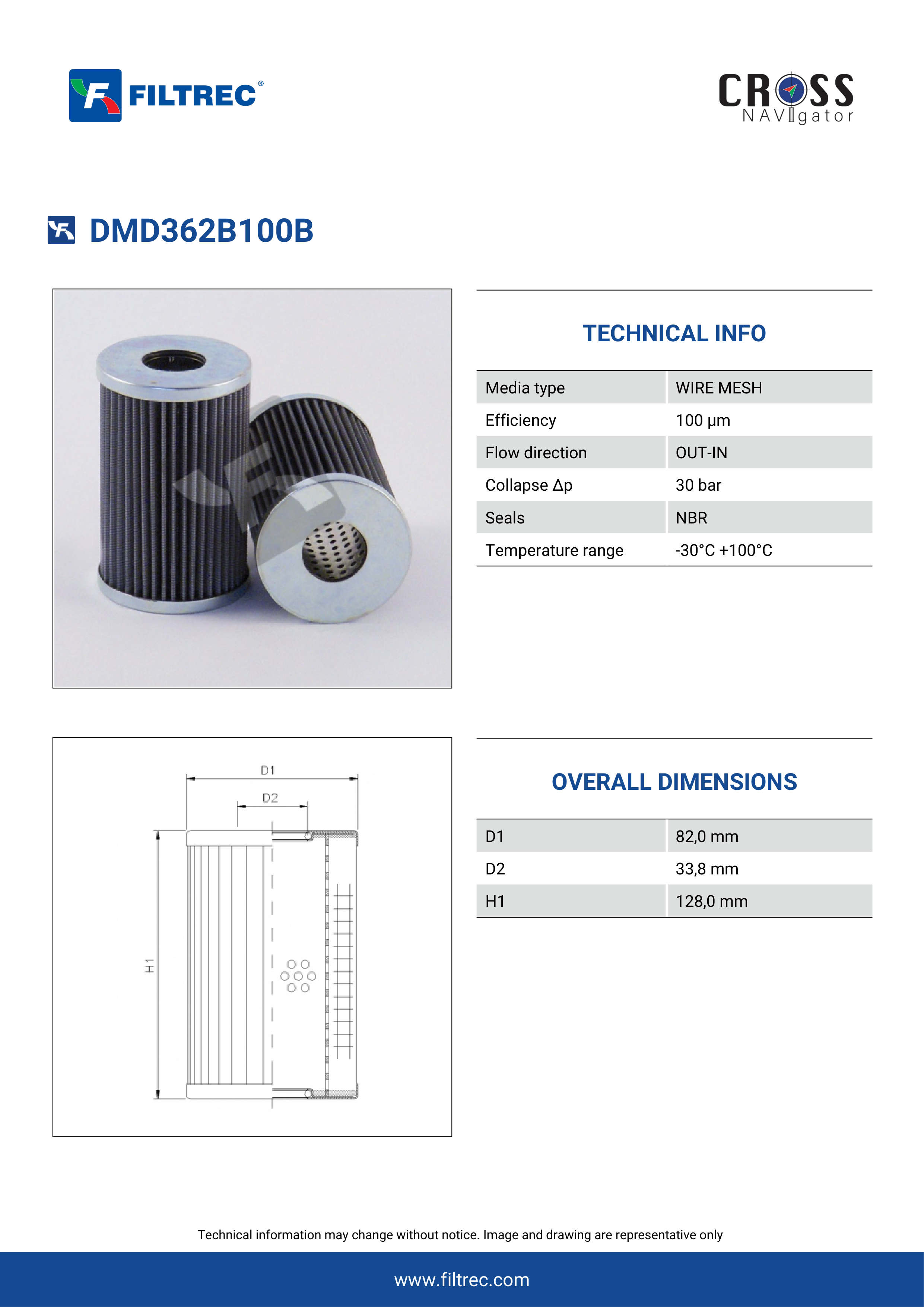 Genuine Filtrec DMD362B100B. This Filtrec element is designed to meet or exceed the quality and performance of brand OEM’s ensuring superior filtration performance and long-lasting durability.