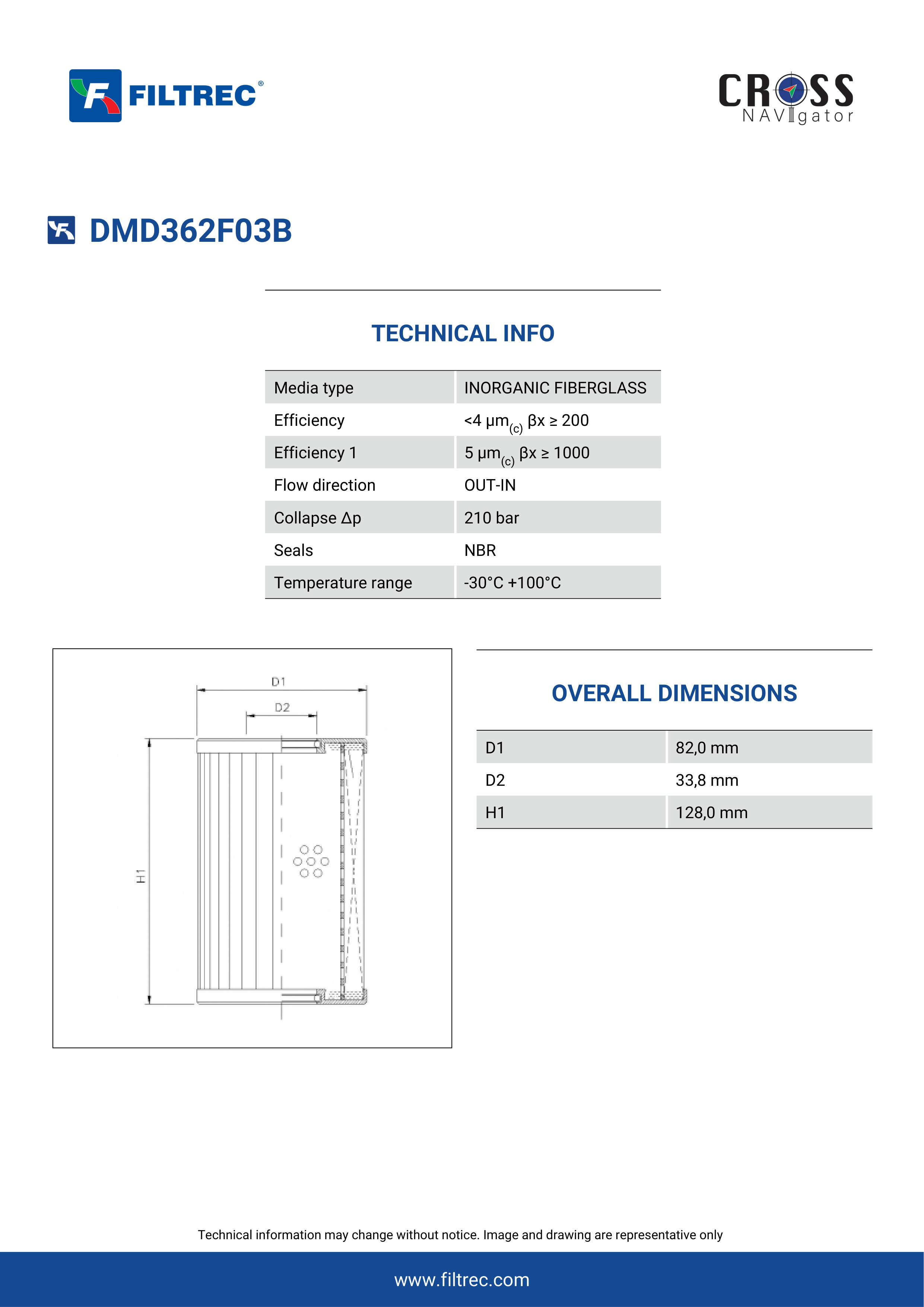 Genuine Filtrec DMD362F03B. This Filtrec element is designed to meet or exceed the quality and performance of brand OEM’s ensuring superior filtration performance and long-lasting durability.