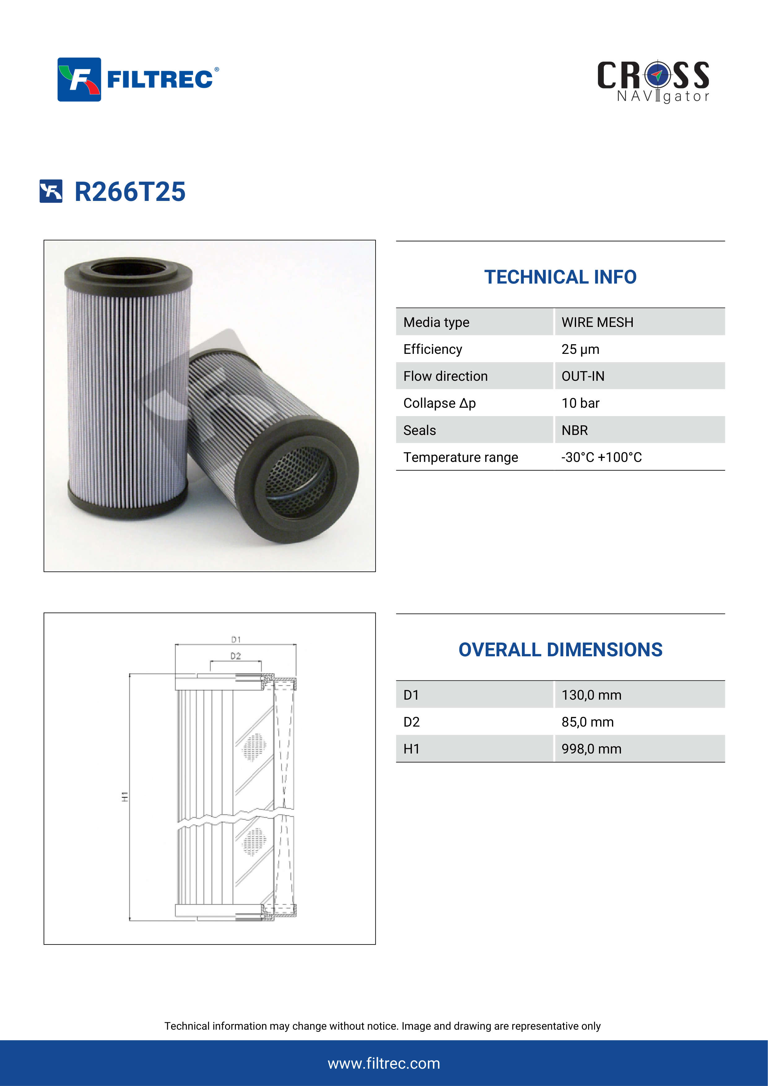 Genuine Filtrec R266T25. This Filtrec element is designed to meet or exceed the quality and performance of brand OEM’s ensuring superior filtration performance and long-lasting durability.