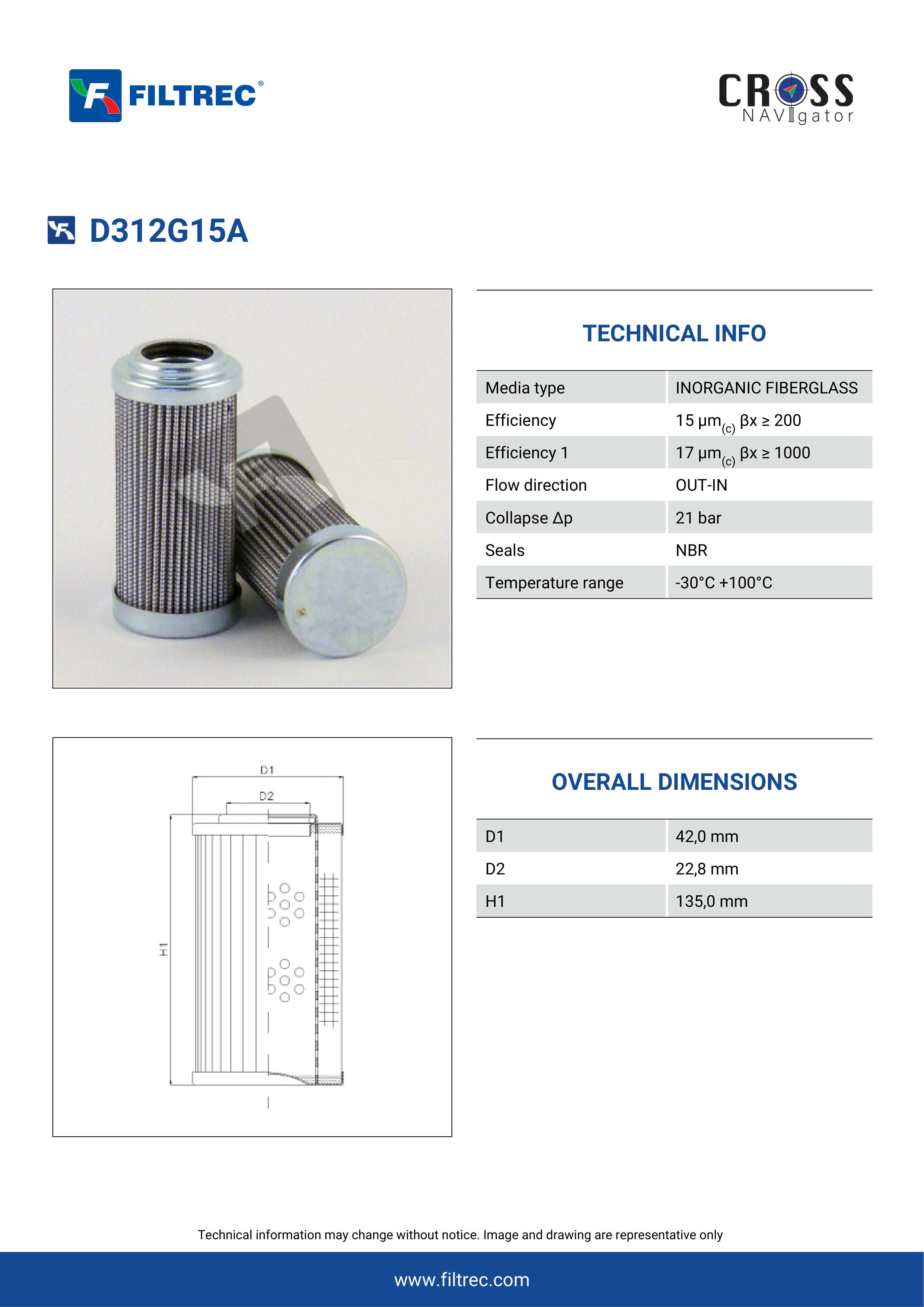 Genuine Filtrec D312G15A. This Filtrec element is designed to meet or exceed the quality and performance of brand OEM’s ensuring superior filtration performance and long-lasting durability.
