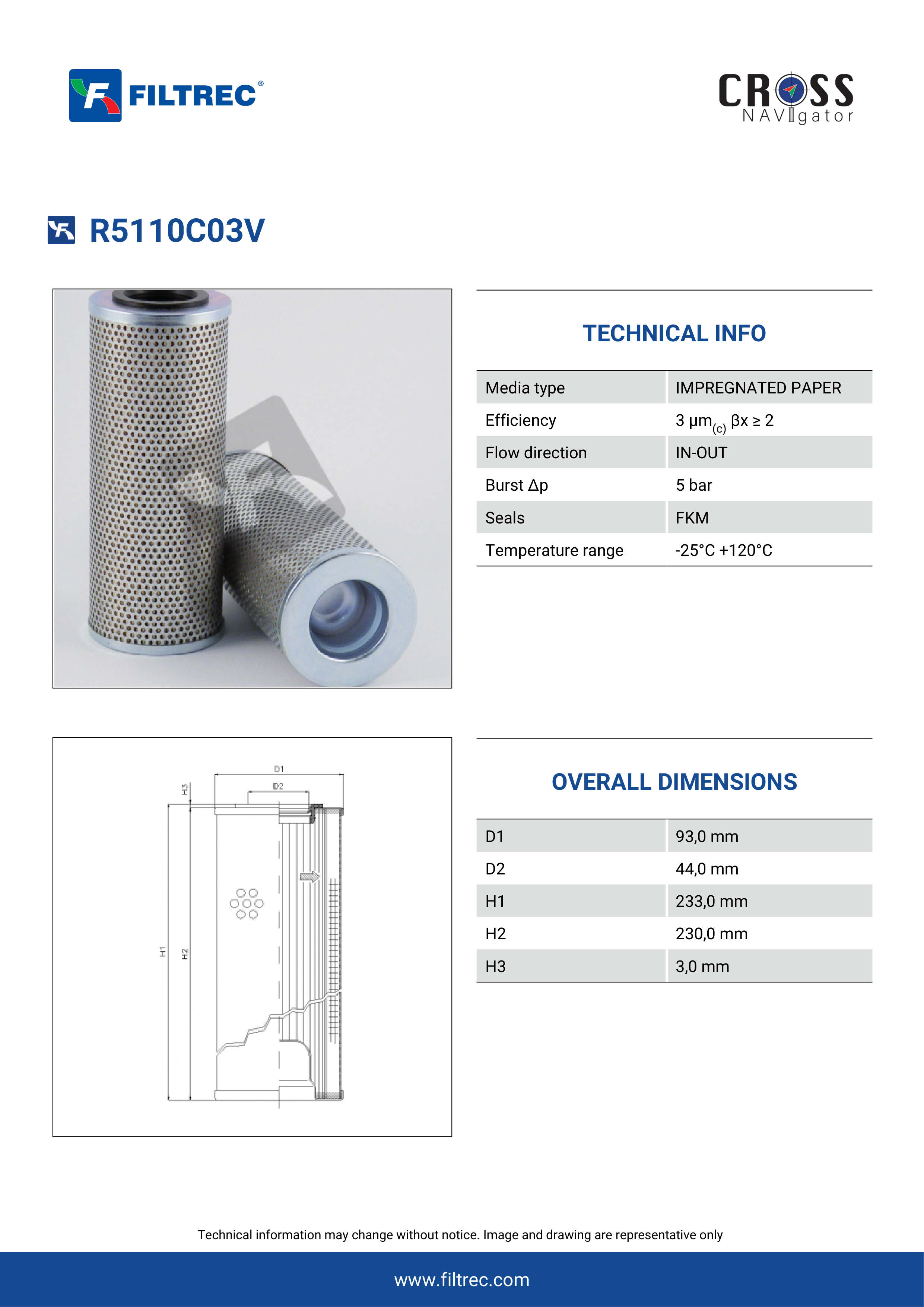 Genuine Filtrec R5110C03V. This Filtrec element is designed to meet or exceed the quality and performance of brand OEM’s ensuring superior filtration performance and long-lasting durability.Engineered with their high performance media and a durable design, the R5110C03V provides reliable and consistent performance over its lifespan, even in harsh operating environments. When you order from FilterFinder, you can trust that you are getting a reliable and high-quality replacement filter that will keep your system running smoothly.