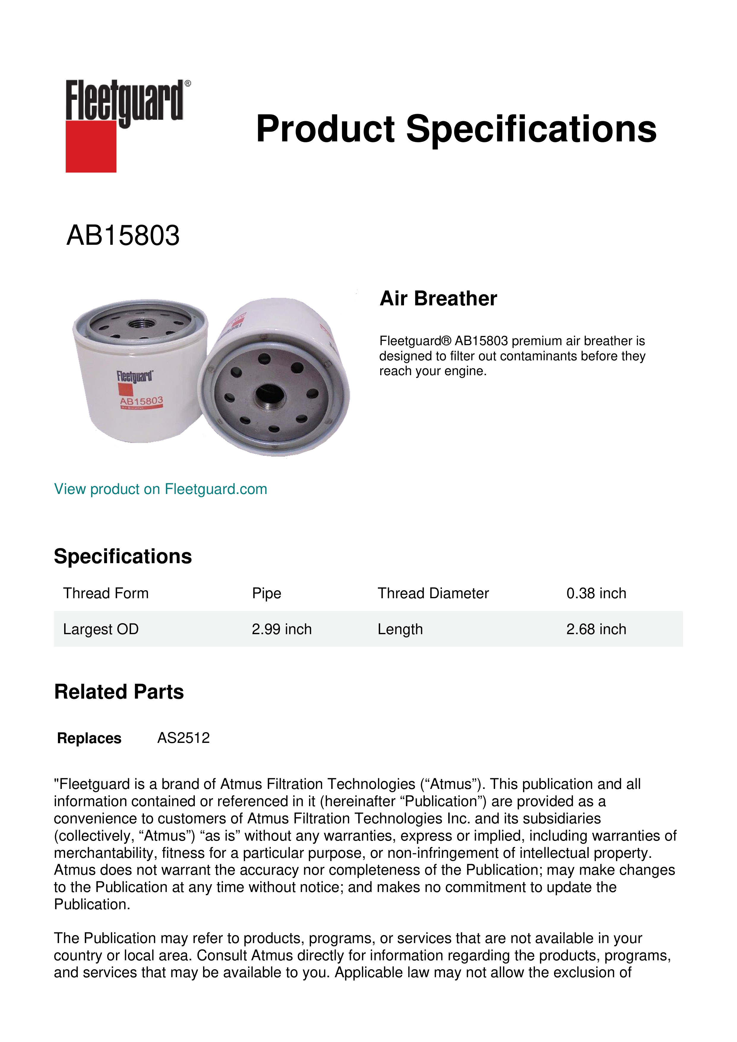 Fleetguard® AB15803 premium air breather is designed to filter out contaminants before they reach your engine.Specification