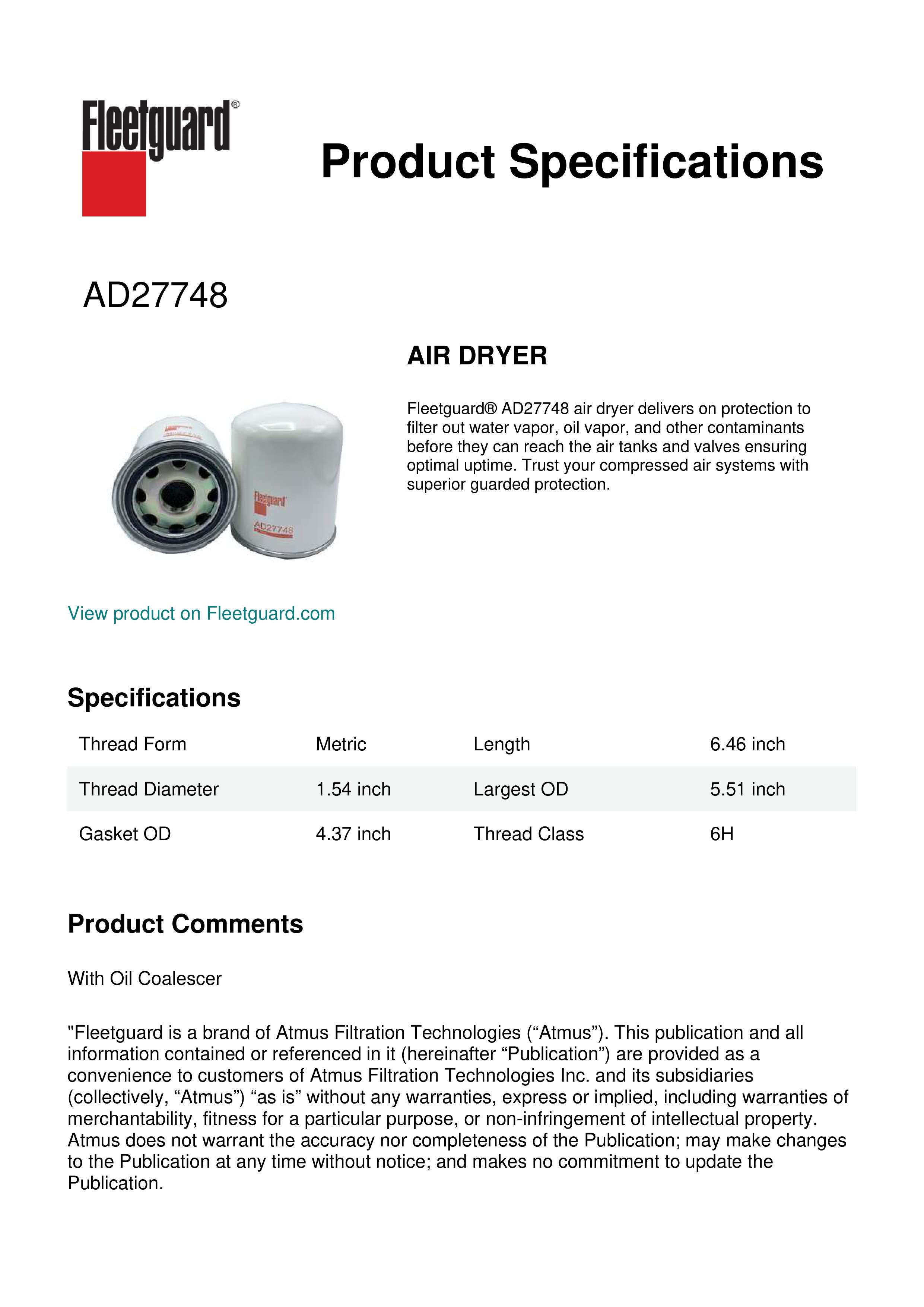 Fleetguard® AD27748 air dryer delivers on protection to filter out water vapor, oil vapor, and other contaminants before they can reach the air tanks and valves ensuring optimal uptime. Trust your compressed air systems with superior guarded protection.Specification