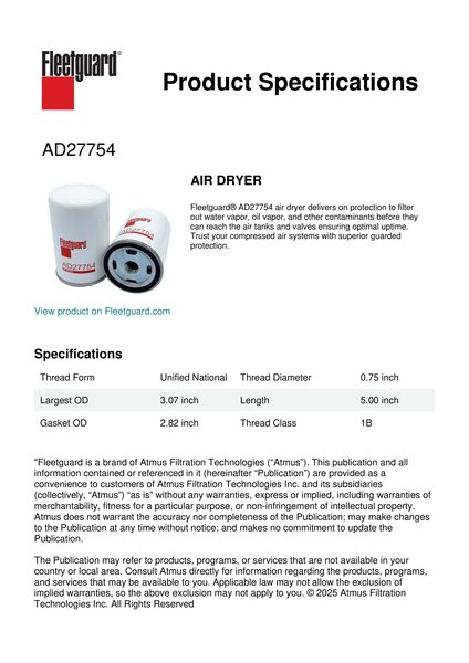 Fleetguard® AD27754 air dryer delivers on protection to filter out water vapor, oil vapor, and other contaminants before they can reach the air tanks and valves ensuring optimal uptime. Trust your compressed air systems with superior guarded protection.Specification