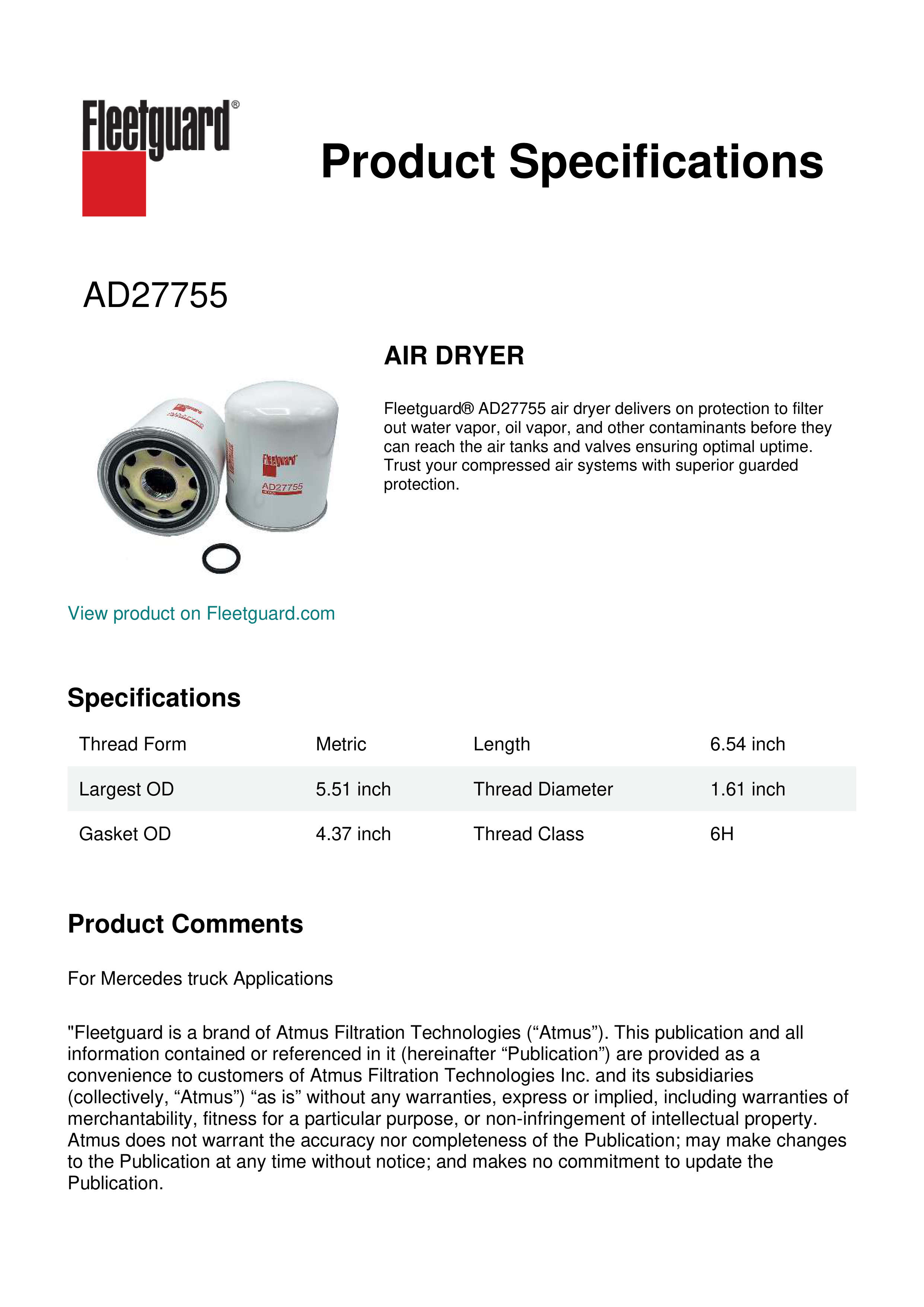 Fleetguard® AD27755 air dryer delivers on protection to filter out water vapor, oil vapor, and other contaminants before they can reach the air tanks and valves ensuring optimal uptime. Trust your compressed air systems with superior guarded protection.Specification