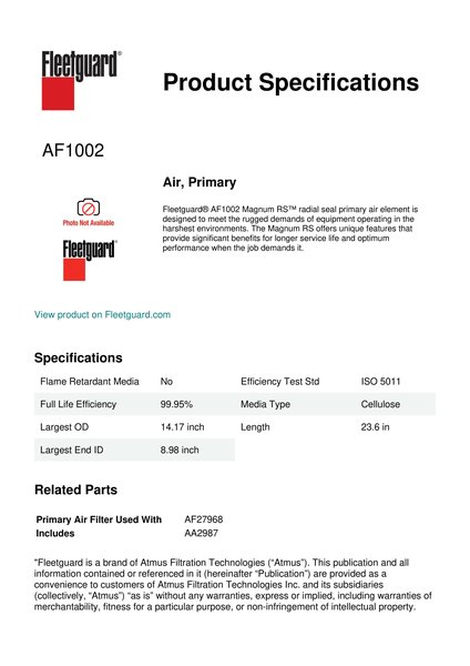 Fleetguard® AF1002 Magnum RS™ radial seal primary air element is designed to meet the rugged demands of equipment operating in the harshest environments. The Magnum RS offers unique features that provide significant benefits for longer service life and optimum performance when the job demands it.Specification