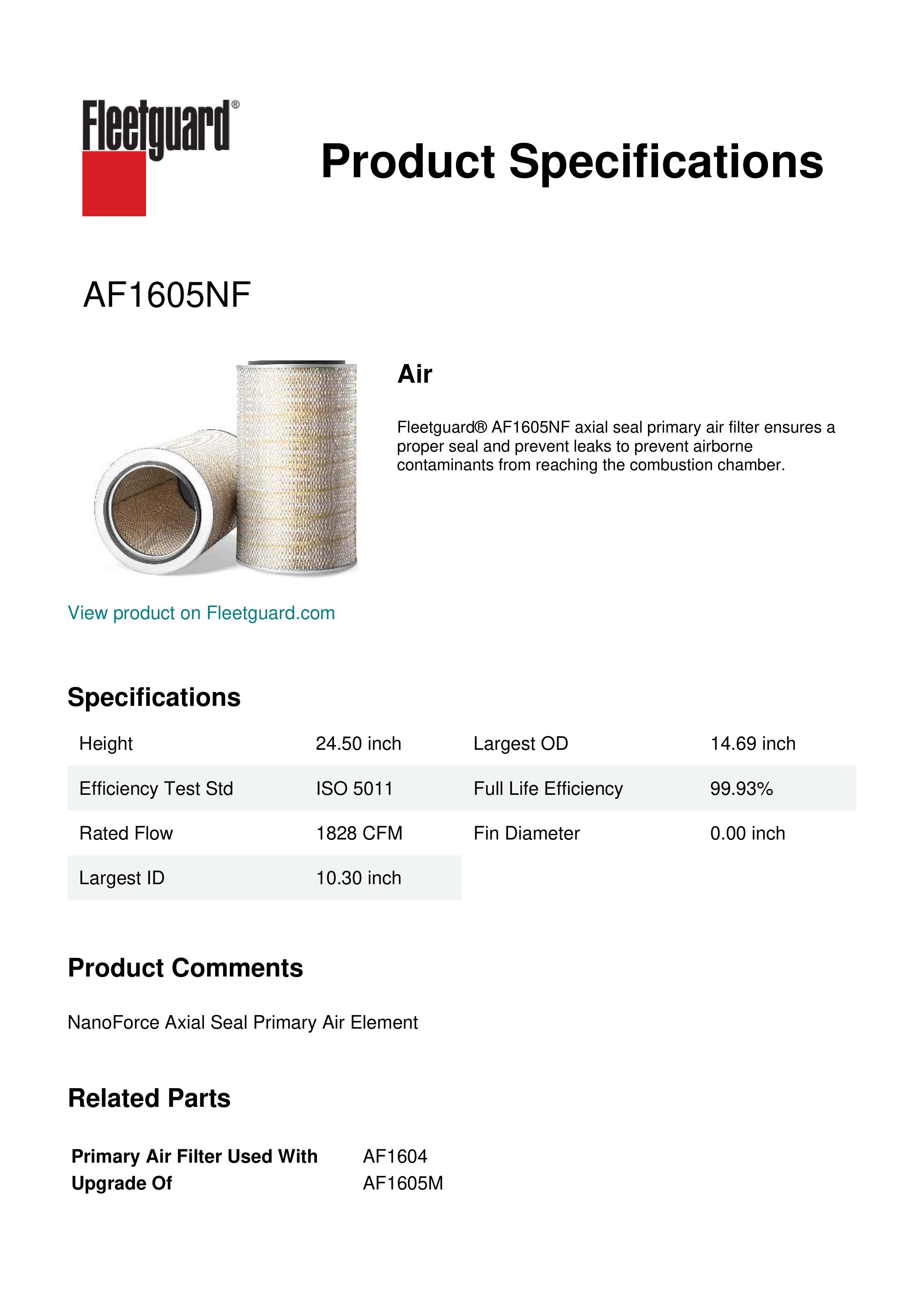 Fleetguard® AF1605NF axial seal primary air filter ensures a proper seal and prevent leaks to prevent airborne contaminants from reaching the combustion chamber.Specification