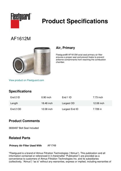 Fleetguard® AF1612M axial seal primary air filter ensures a proper seal and prevent leaks to prevent airborne contaminants from reaching the combustion chamber.