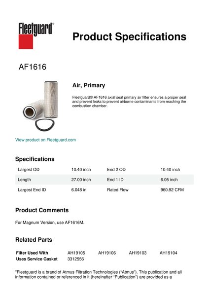 Fleetguard® AF1616 axial seal primary air filter ensures a proper seal and prevent leaks to prevent airborne contaminants from reaching the combustion chamber.