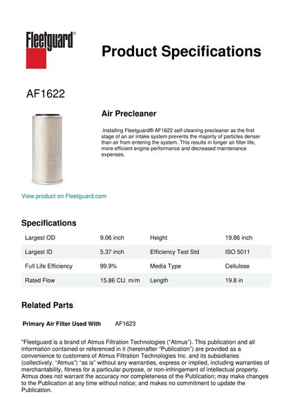 .Installing Fleetguard® AF1622 self-cleaning precleaner as the first stage of an air intake system prevents the majority of particles denser than air from entering the system. This results in longer air filter life, more efficient engine performance and decreased maintenance expenses.Specification