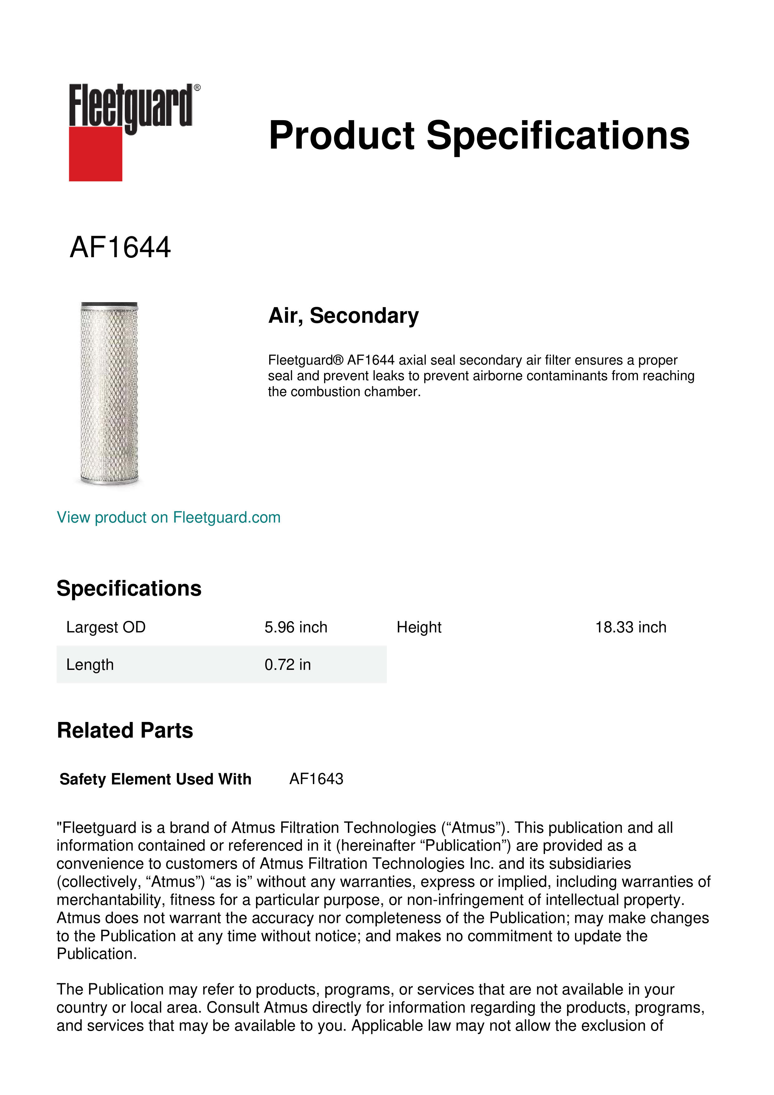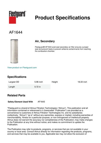 Fleetguard® AF1644 axial seal secondary air filter ensures a proper seal and prevent leaks to prevent airborne contaminants from reaching the combustion chamber.Specification