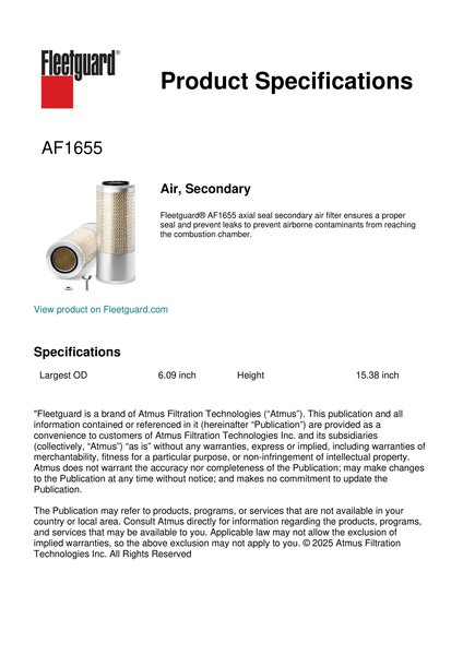 Fleetguard® AF1655 axial seal secondary air filter ensures a proper seal and prevent leaks to prevent airborne contaminants from reaching the combustion chamber.Specification