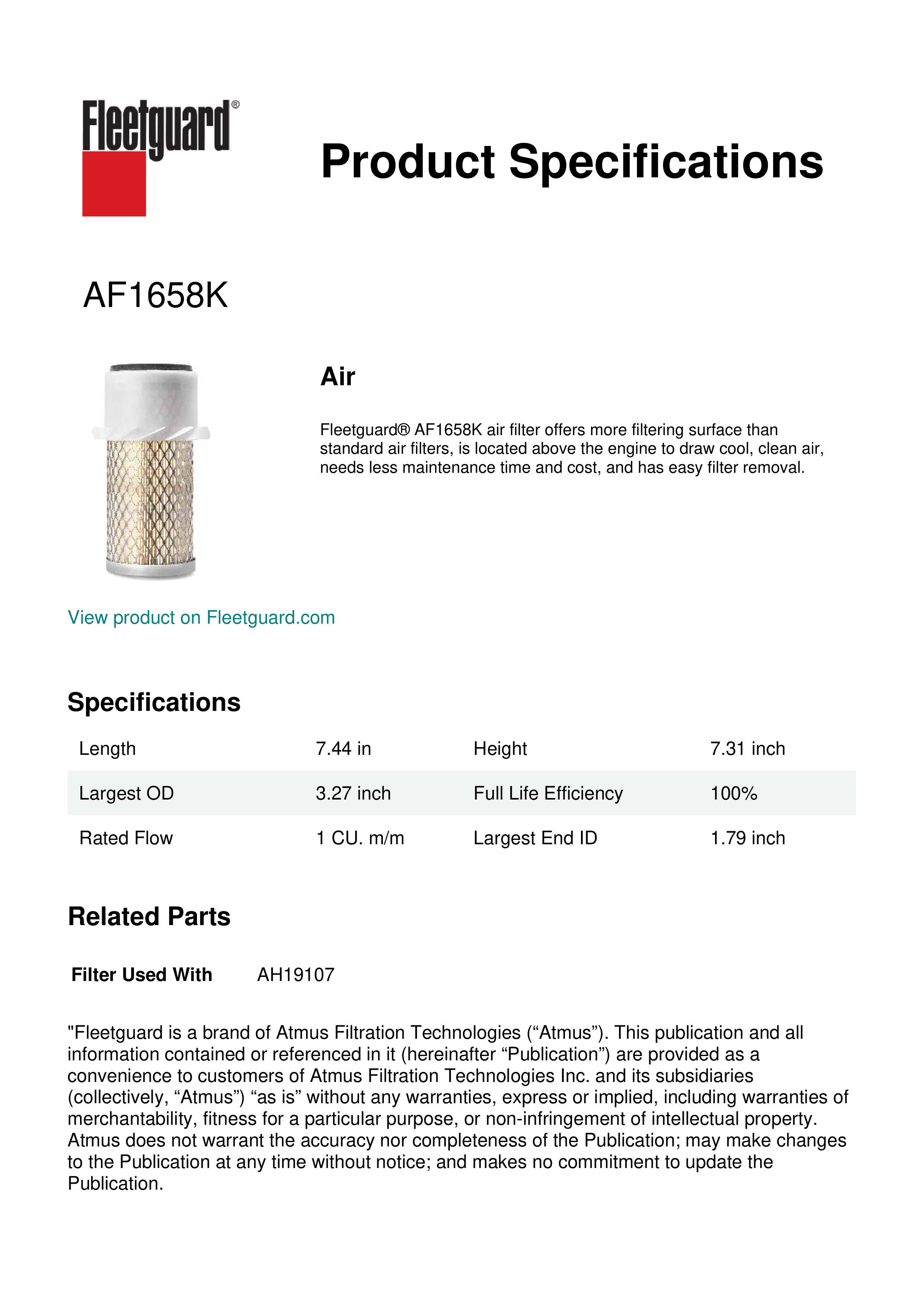 Fleetguard® AF1658K air filter offers more filtering surface than standard air filters, is located above the engine to draw cool, clean air, needs less maintenance time and cost, and has easy filter removal.Specification