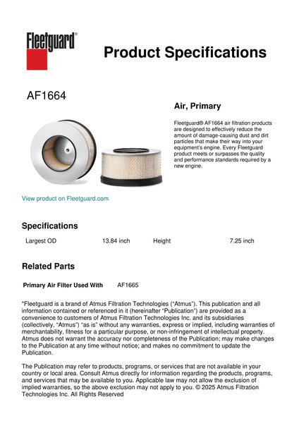 Fleetguard® AF1664 air filtration products are designed to effectively reduce the amount of damage-causing dust and dirt particles that make their way into your equipment’s engine. Every Fleetguard product meets or surpasses the quality and performance standards required by a new engine.Specification
