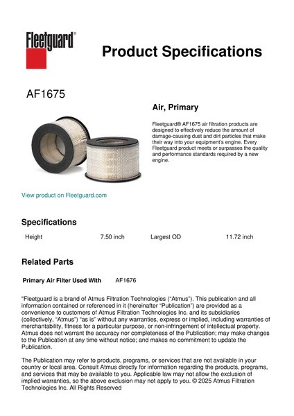 Fleetguard® AF1675 air filtration products are designed to effectively reduce the amount of damage-causing dust and dirt particles that make their way into your equipment’s engine. Every Fleetguard product meets or surpasses the quality and performance standards required by a new engine.Specification