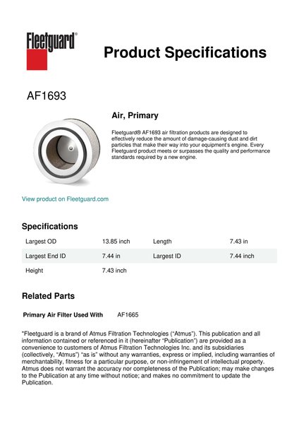 Fleetguard® AF1693 air filtration products are designed to effectively reduce the amount of damage-causing dust and dirt particles that make their way into your equipment’s engine. Every Fleetguard product meets or surpasses the quality and performance standards required by a new engine.Specification