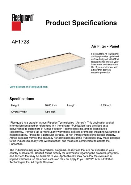 Fleetguard® AF1728 panel air filter provides optimized airflow designed with OEM requirements. Protect your investment and extend the life of your equipment with a filter that delivers superior protection.Specification
