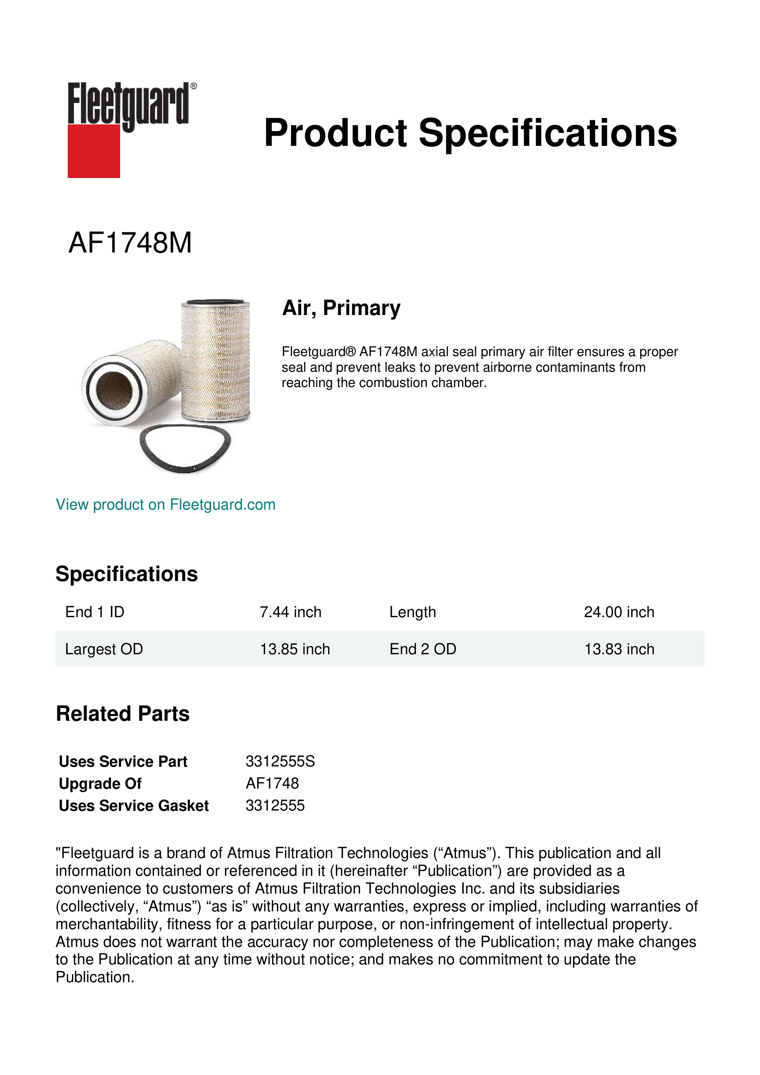 Fleetguard® AF1748M axial seal primary air filter ensures a proper seal and prevent leaks to prevent airborne contaminants from reaching the combustion chamber.Specification