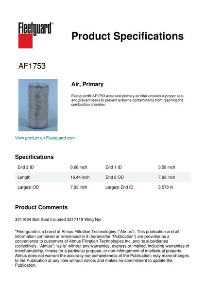 Fleetguard® AF1753 axial seal primary air filter ensures a proper seal and prevent leaks to prevent airborne contaminants from reaching the combustion chamber.