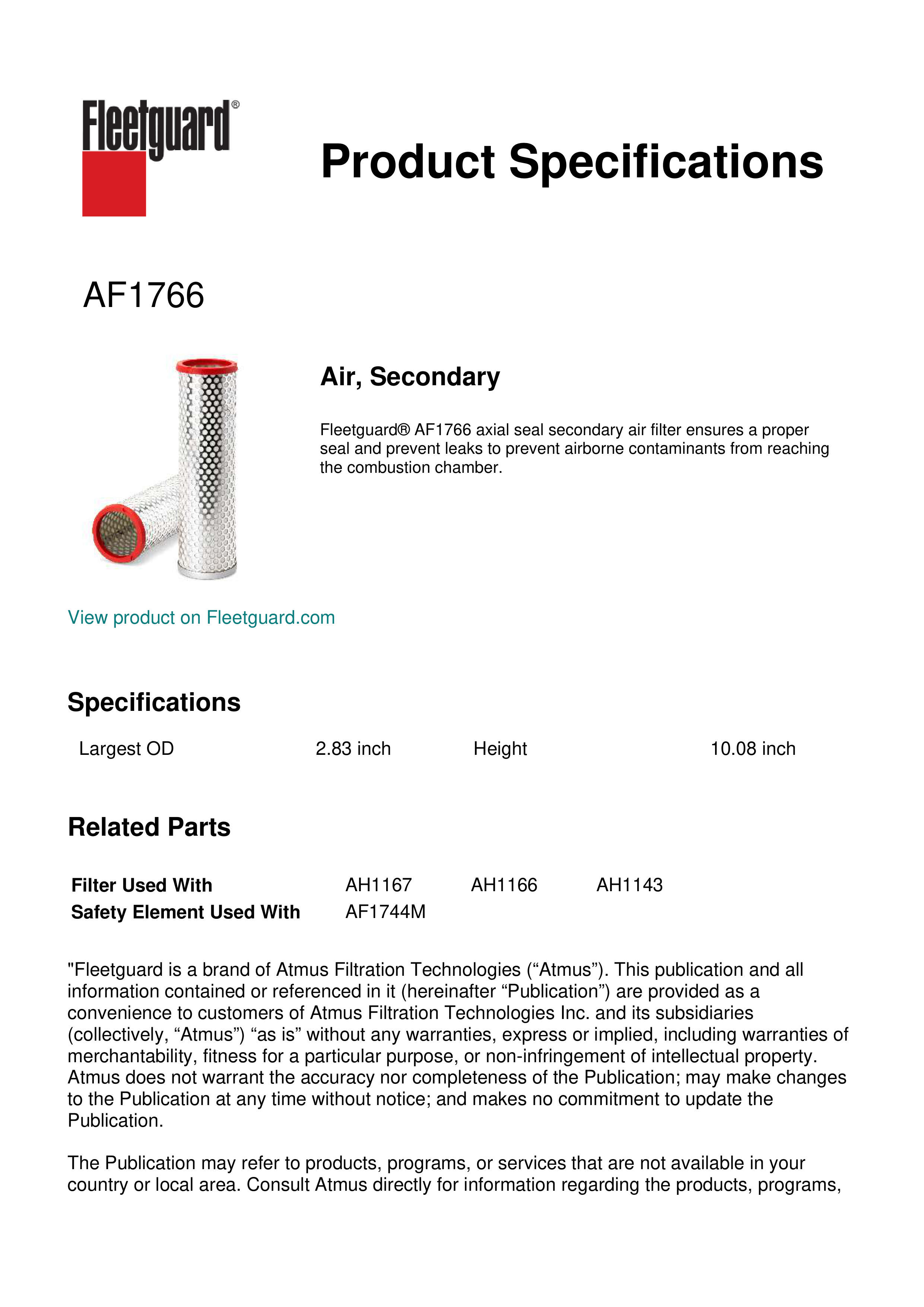 Fleetguard® AF1766 axial seal secondary air filter ensures a proper seal and prevent leaks to prevent airborne contaminants from reaching the combustion chamber.