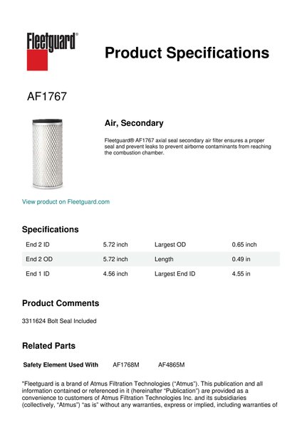 Fleetguard® AF1767 axial seal secondary air filter ensures a proper seal and prevent leaks to prevent airborne contaminants from reaching the combustion chamber.