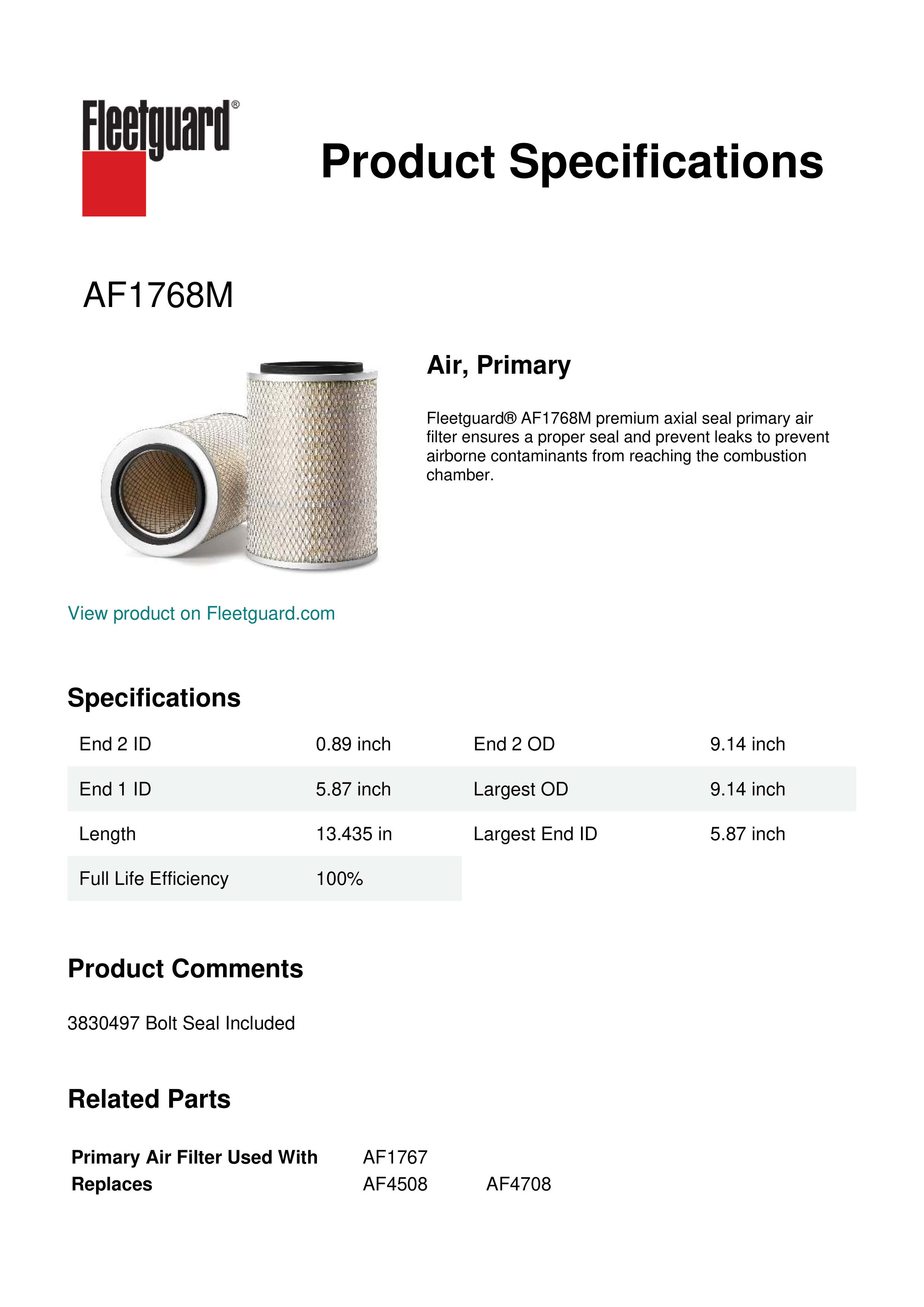 Fleetguard® AF1768M premium axial seal primary air filter ensures a proper seal and prevent leaks to prevent airborne contaminants from reaching the combustion chamber.Specification