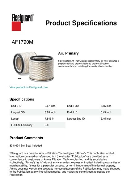 Fleetguard® AF1790M axial seal primary air filter ensures a proper seal and prevent leaks to prevent airborne contaminants from reaching the combustion chamber.Specification