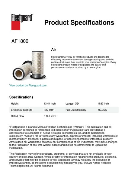 Fleetguard® AF1800 air filtration products are designed to effectively reduce the amount of damage-causing dust and dirt particles that make their way into your equipment’s engine. Every Fleetguard product meets or surpasses the quality and performance standards required by a new engine.Specification