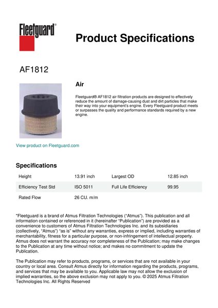 Fleetguard® AF1812 air filtration products are designed to effectively reduce the amount of damage-causing dust and dirt particles that make their way into your equipment’s engine. Every Fleetguard product meets or surpasses the quality and performance standards required by a new engine.Specification