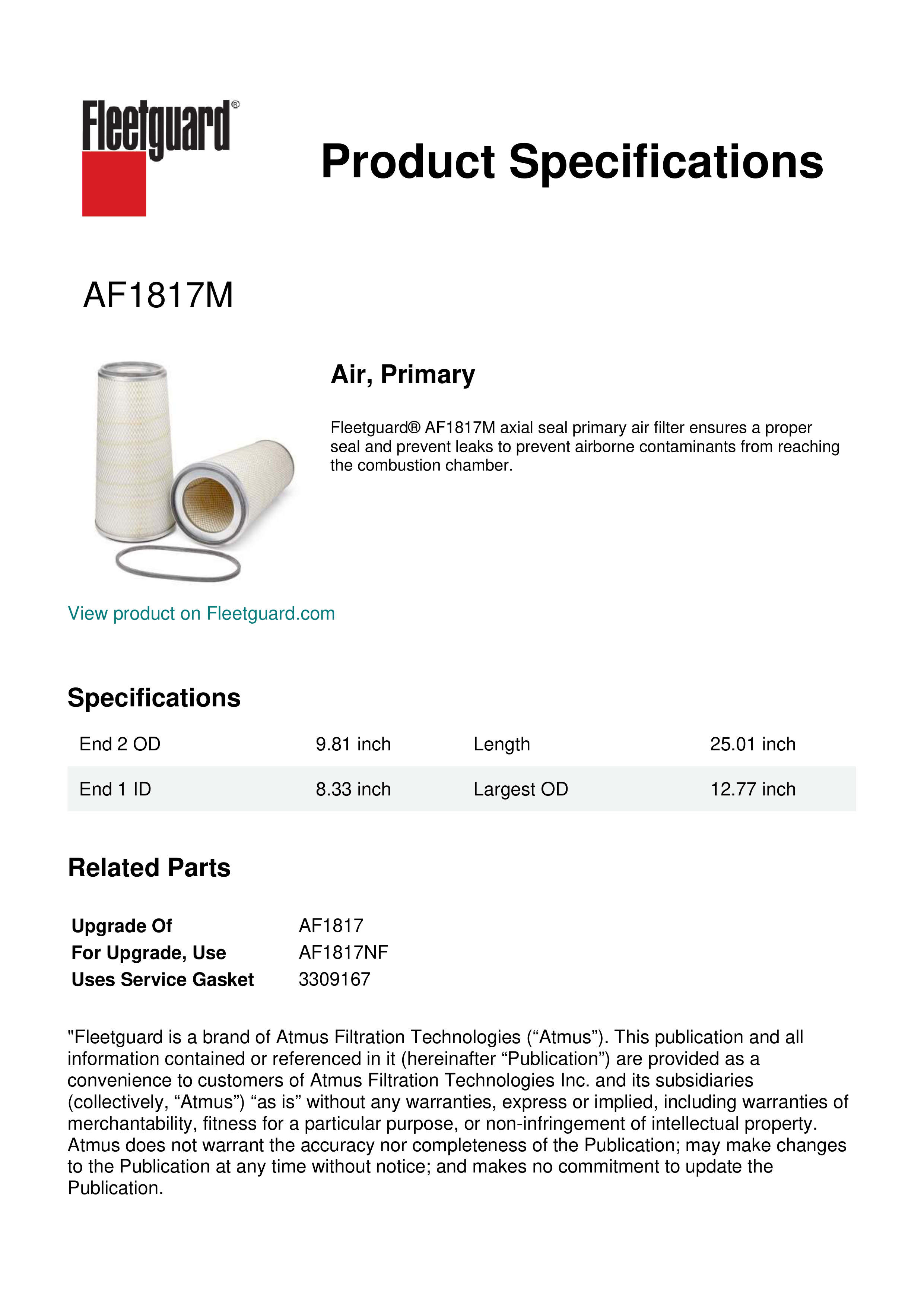 Fleetguard® AF1817M axial seal primary air filter ensures a proper seal and prevent leaks to prevent airborne contaminants from reaching the combustion chamber.