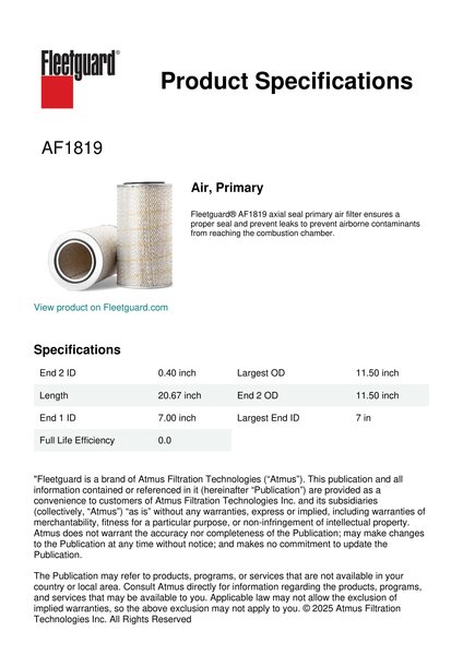 Fleetguard® AF1819 axial seal primary air filter ensures a proper seal and prevent leaks to prevent airborne contaminants from reaching the combustion chamber.