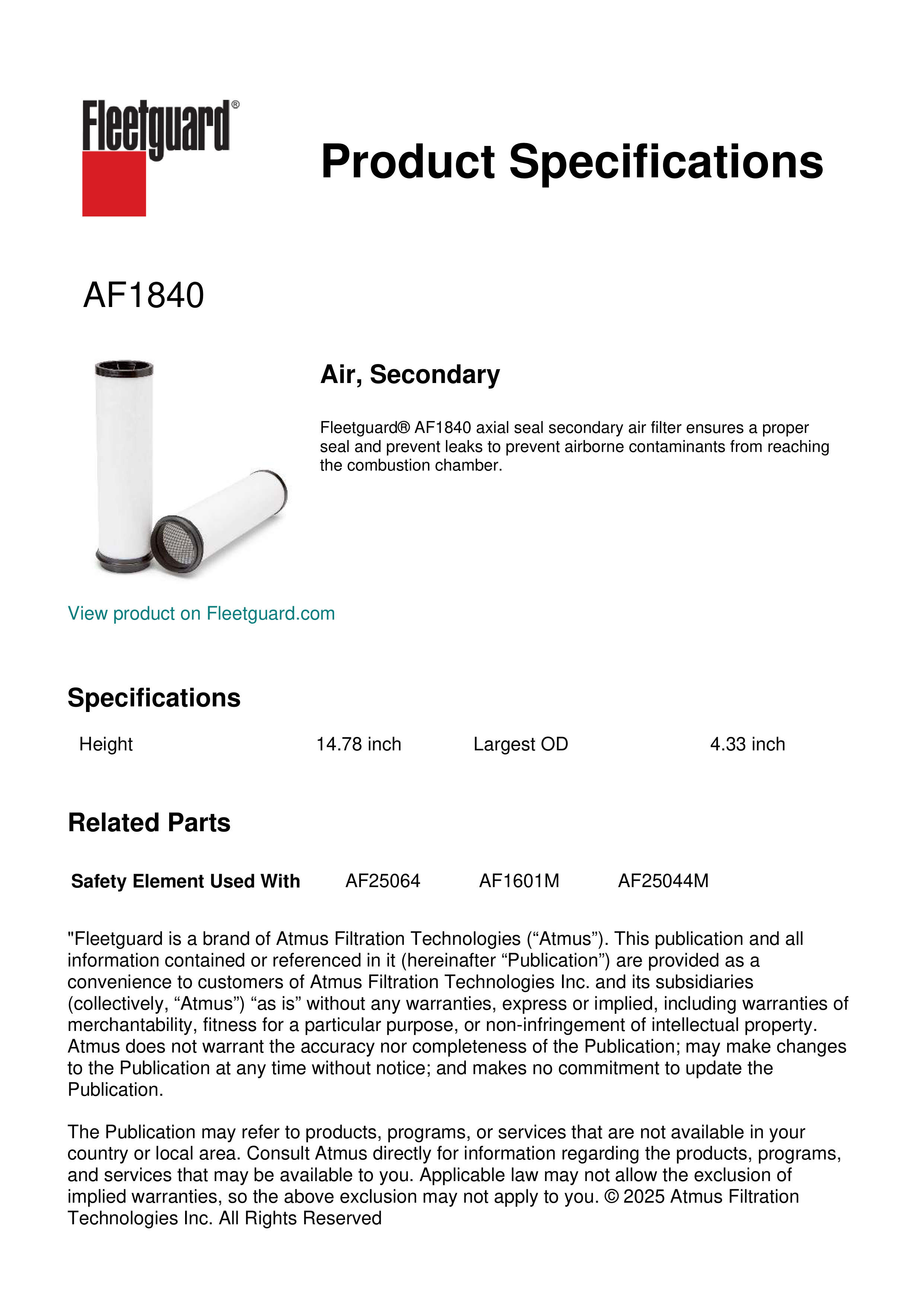 Fleetguard® AF1840 axial seal secondary air filter ensures a proper seal and prevent leaks to prevent airborne contaminants from reaching the combustion chamber.Specification